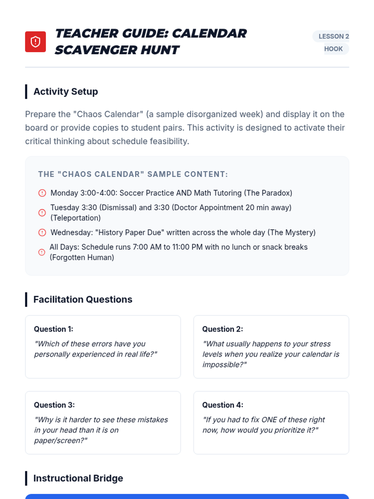A facilitation guide for teachers to lead the 'Calendar Scavenger Hunt' hook, including sample chaos calendar entries and discussion prompts.