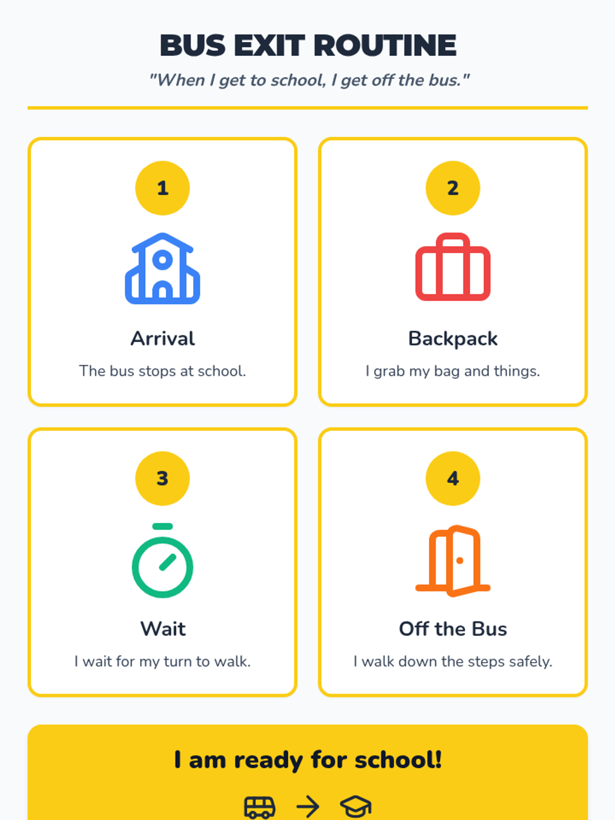 A 4-step visual schedule for students to follow when exiting the school bus, featuring clear icons and simple language.