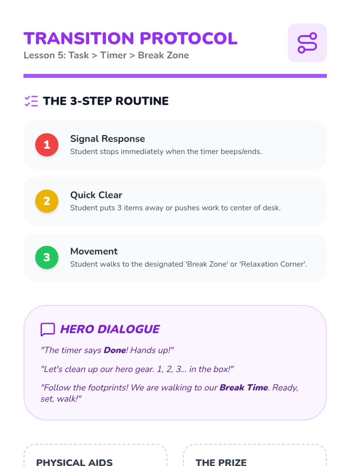 A teacher facilitation guide for Lesson 5, focusing on the full transition routine from work to break zone, including safety tips and scripting.