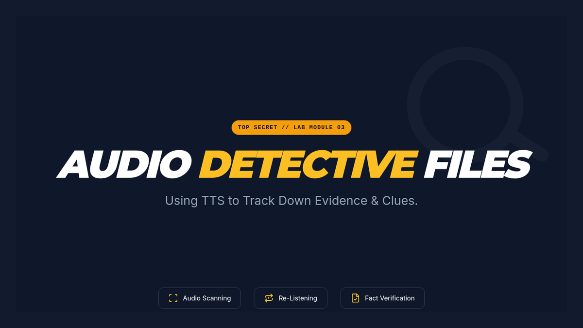 Slide deck for Lesson 3, introducing the detective theme, the "Scan" and "Loop" techniques for finding and verifying evidence with TTS.