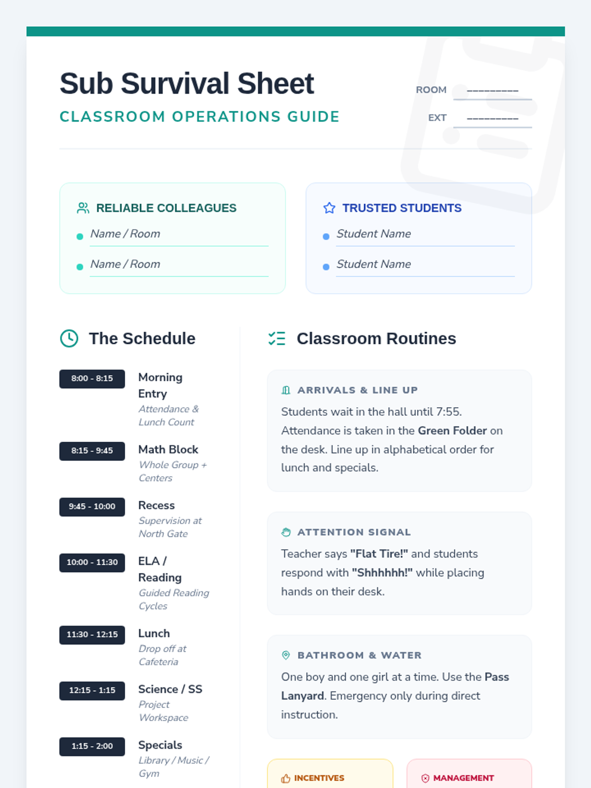 A refined one-page substitute teacher cheat sheet with a professional design, featuring a detailed schedule, routine highlights, behavior management, and a structured end-of-day feedback section.