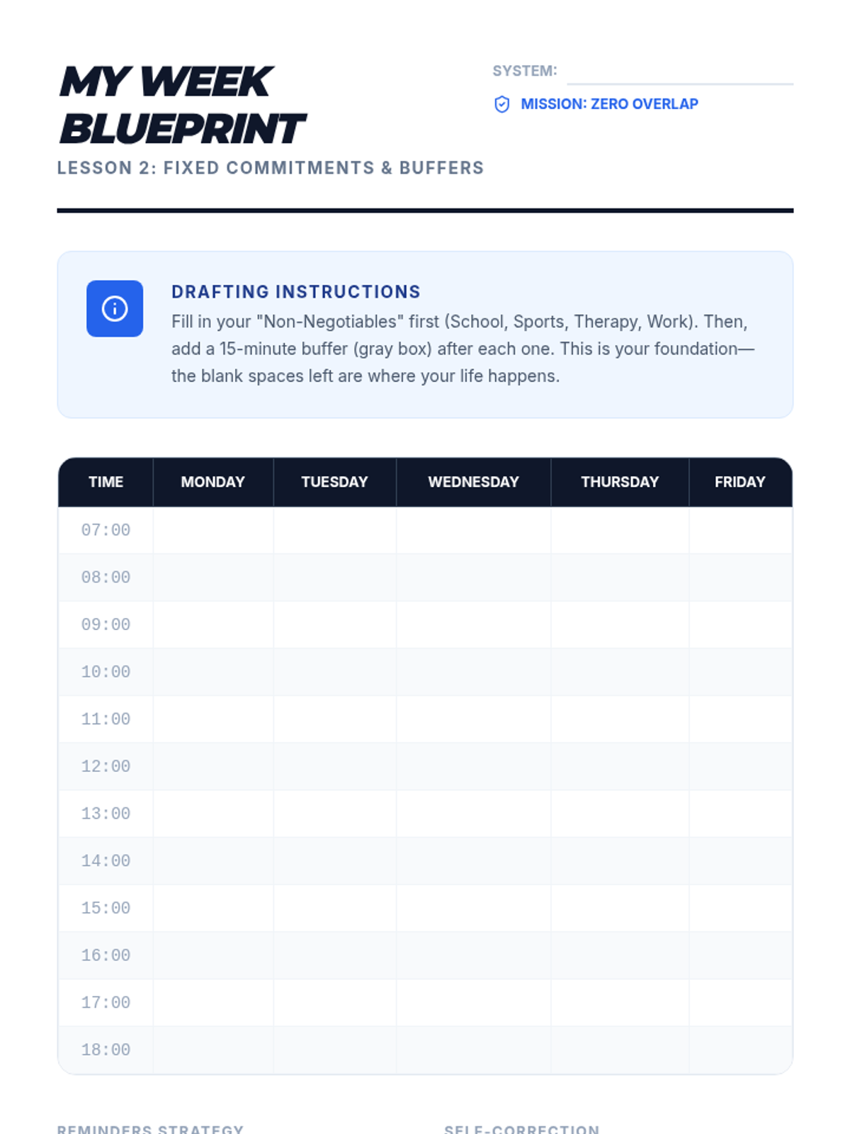 A calendar template designed for students to identify fixed commitments and incorporate necessary buffer times into their weekly schedule.