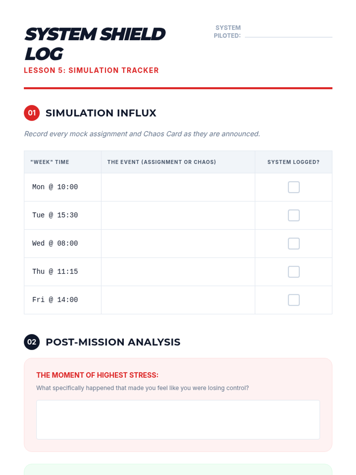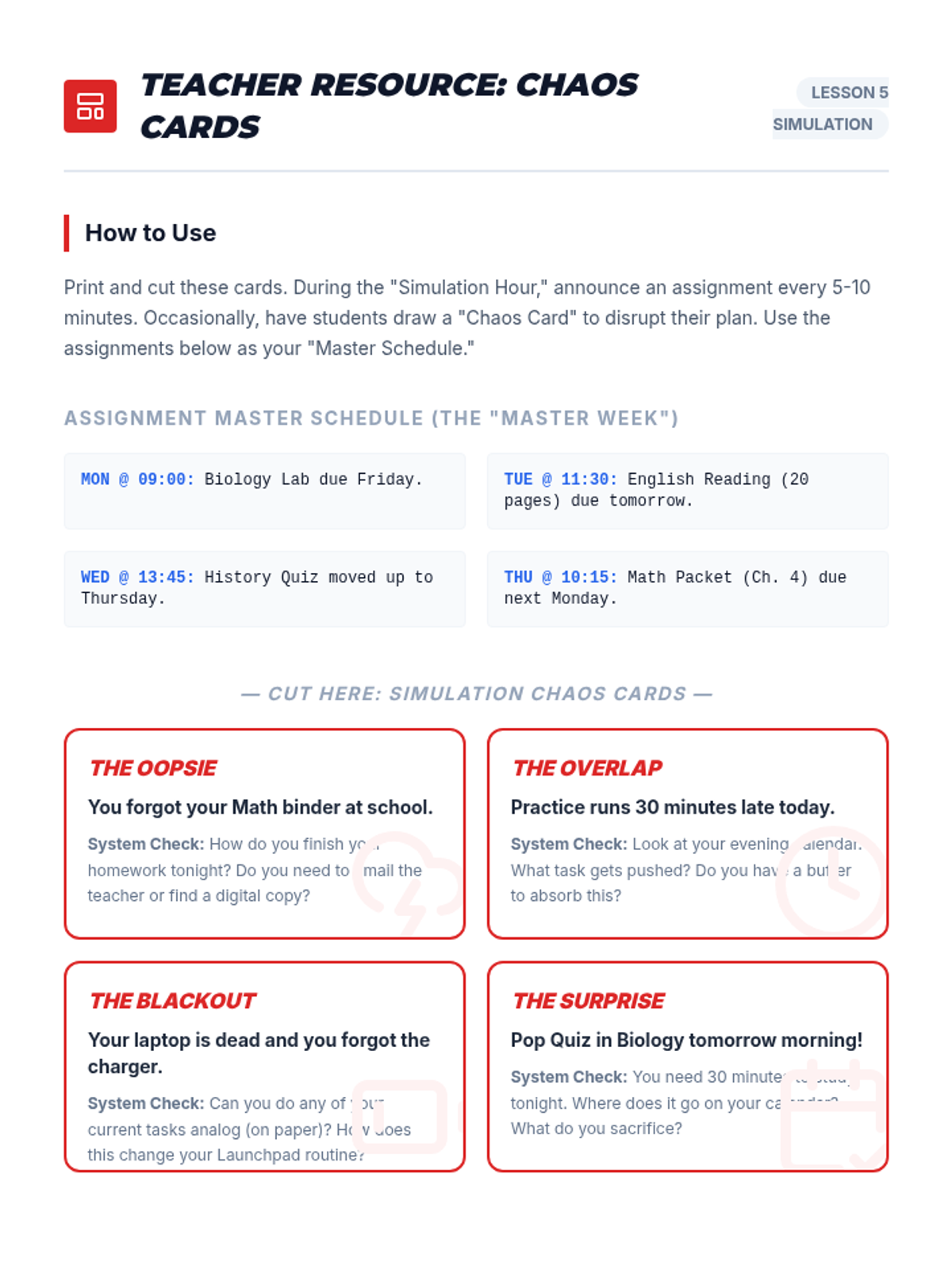 Simulation instructions and debrief slides for Lesson 5, putting students' organizational systems through a 'stress test' with mock assignments and surprise events.