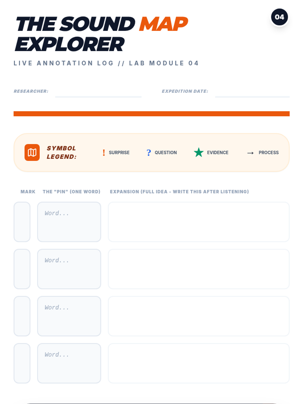Student activity sheet for Lesson 4, featuring a symbol-based annotation log for live listening practice.