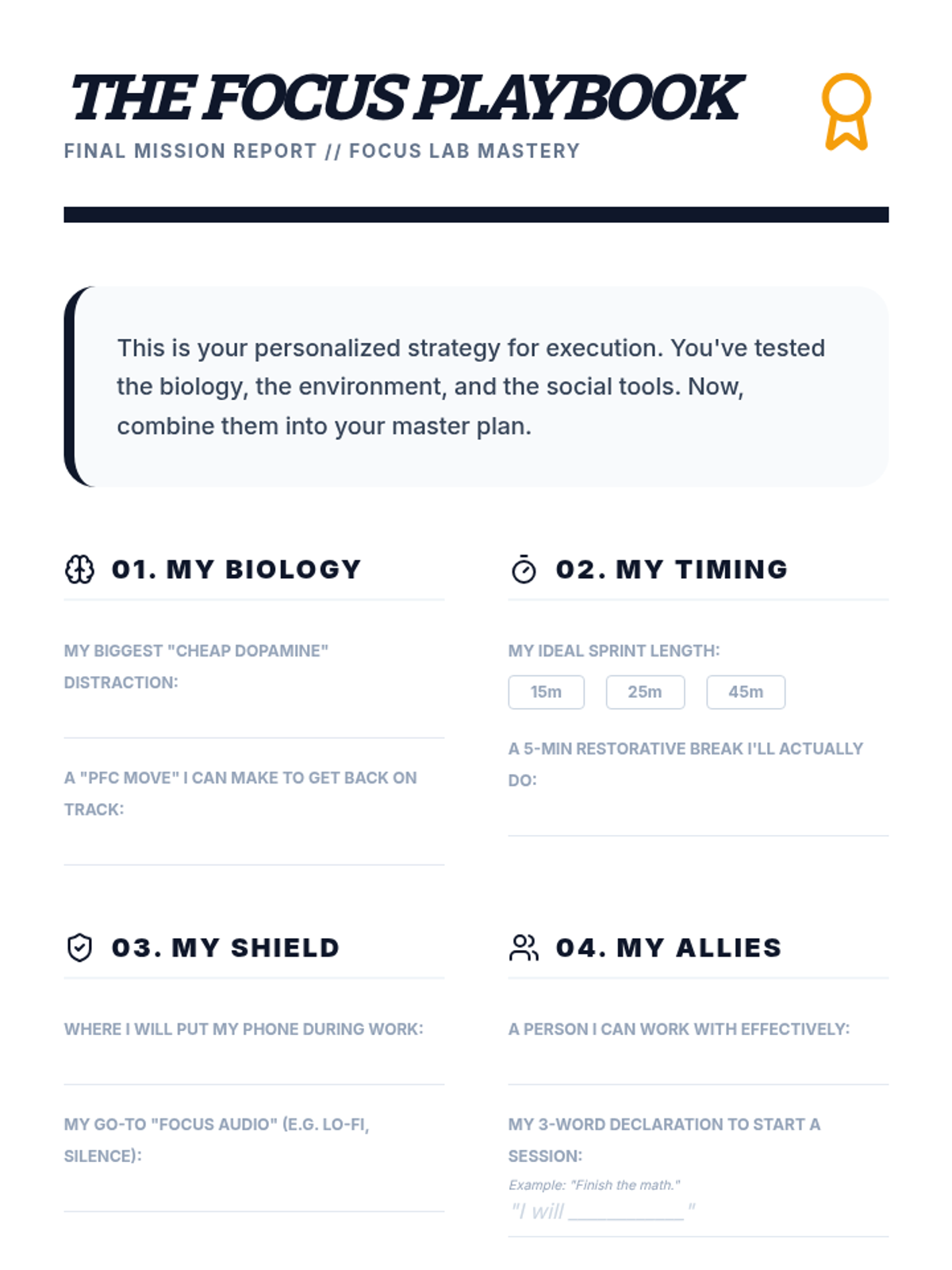 A summative document for the unit where students synthesize their learnings into a personalized focus and execution plan.