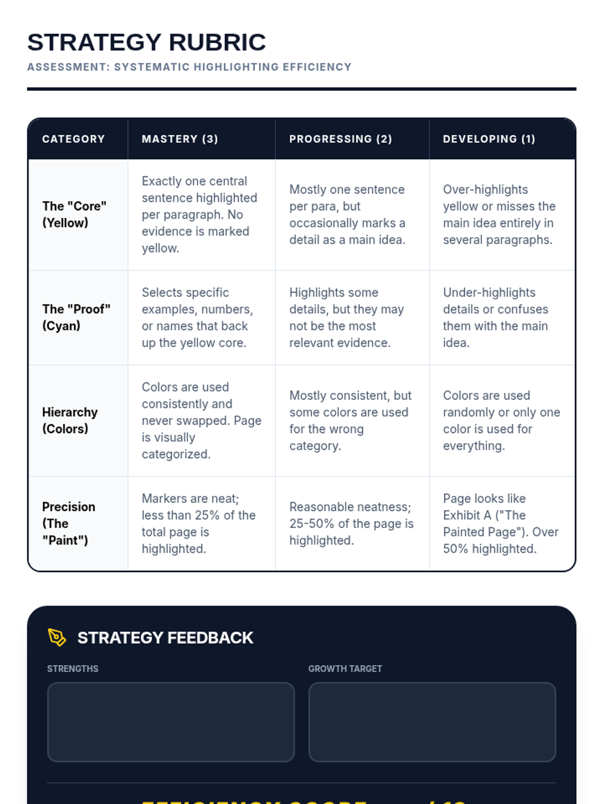 A grading rubric for the final highlighting assessment, focusing on color consistency, information categorization, and avoiding over-highlighting.