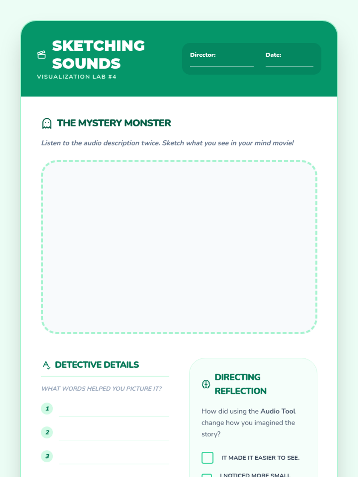 A student worksheet for visualizing descriptive audio, including a drawing space for the 'Mystery Monster' and reflection questions.