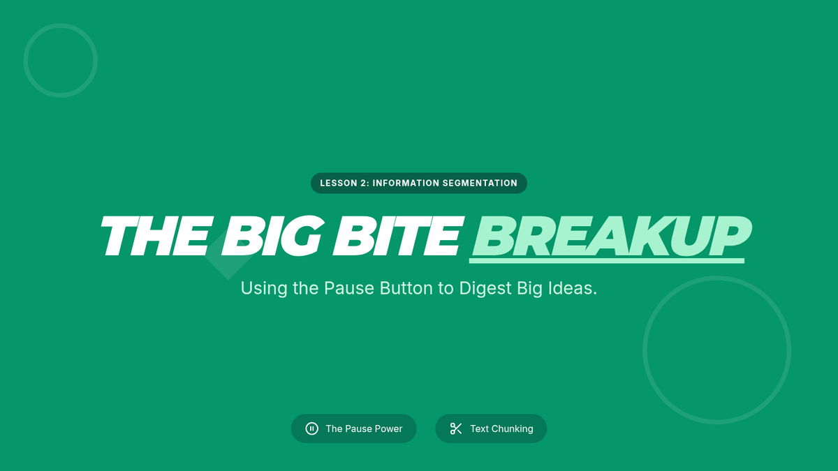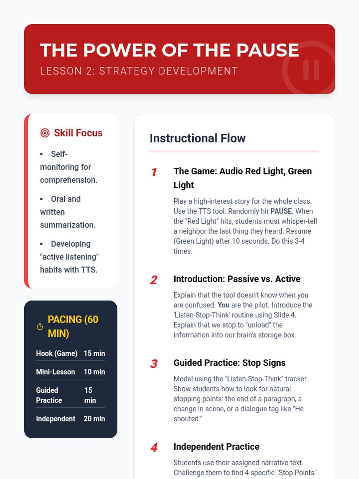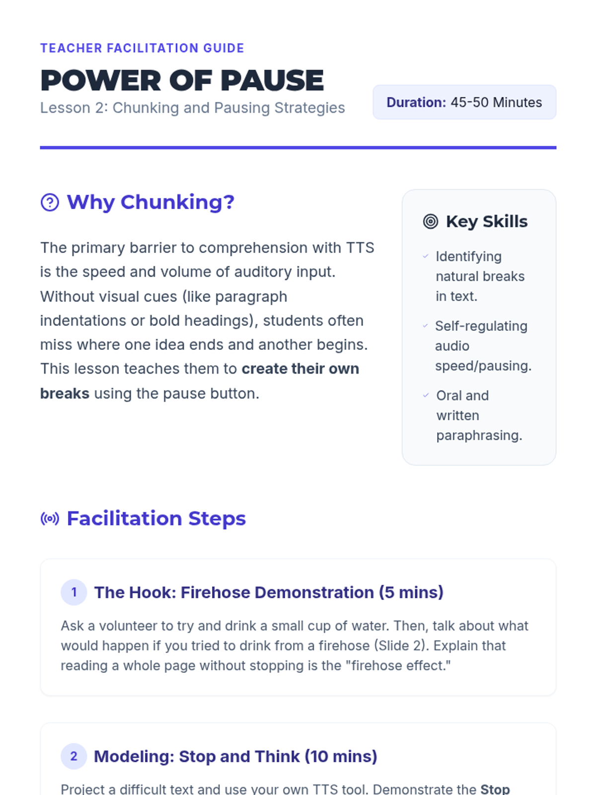 Slide deck for Lesson 2: Chunking and Pausing Skills, introducing the "Stop and Think" routine and the concept of information chunking for TTS.