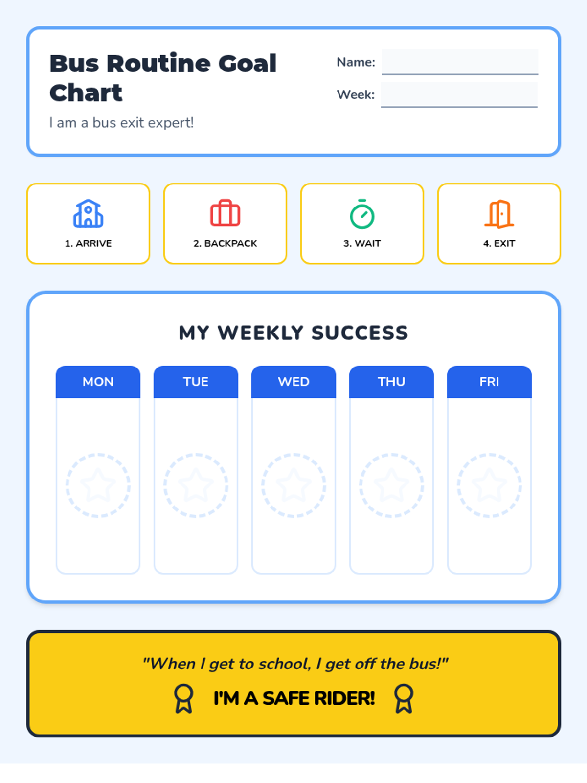 A weekly goal chart for students to track their progress in following the bus exit routine, featuring space for stickers or checkmarks.