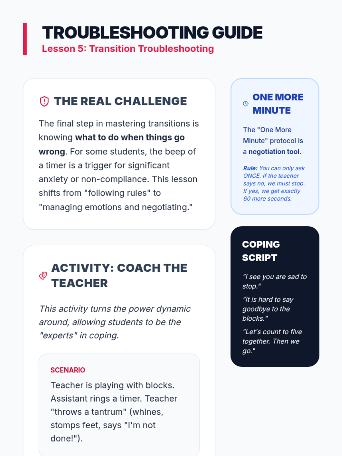 A guide for teachers to lead the role-play activities and manage the 'One More Minute' protocol during transition troubleshooting.