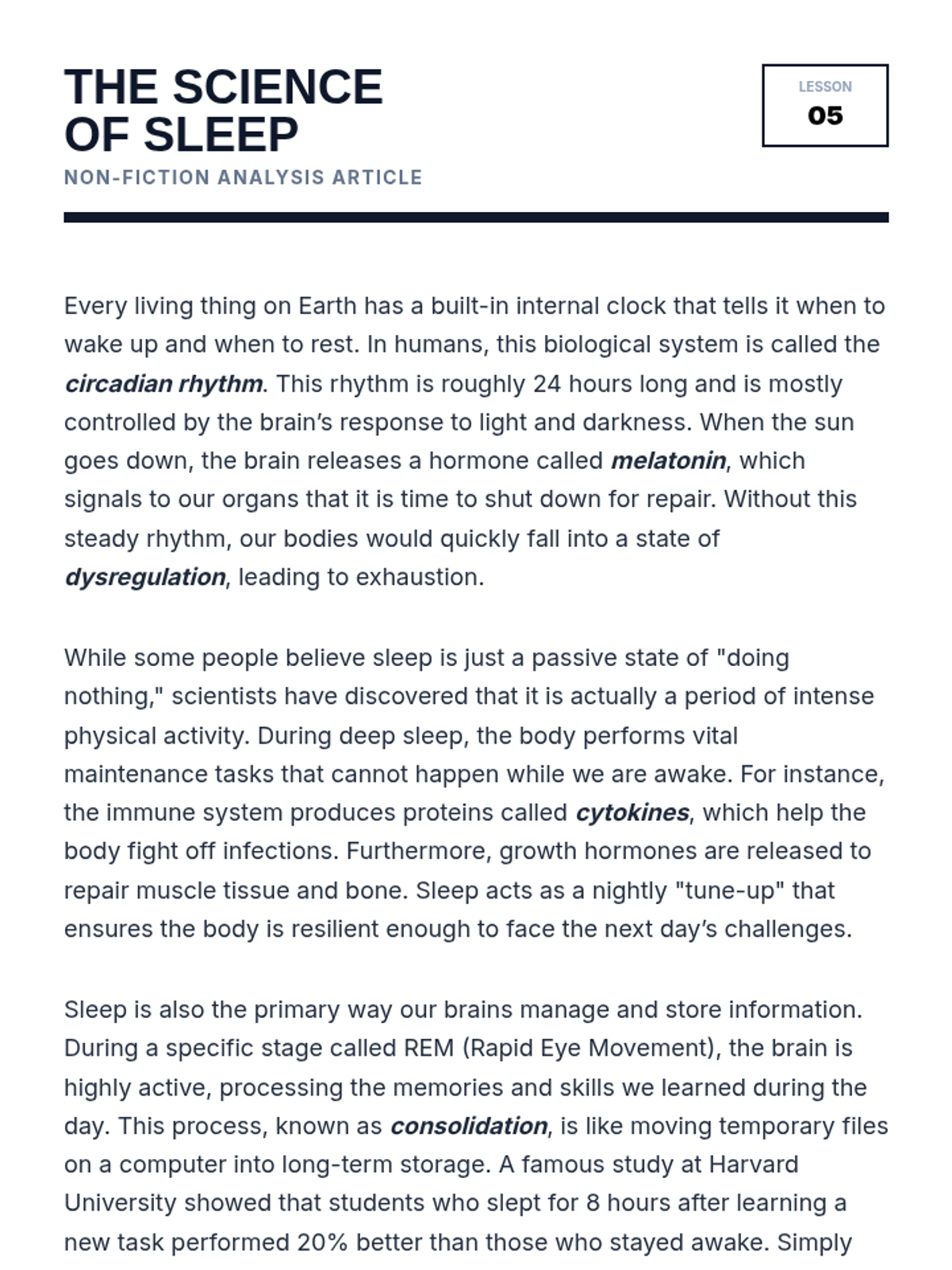 A 2-page non-fiction article on 'The Science of Sleep' designed for students to apply their final three-color highlighting strategy.