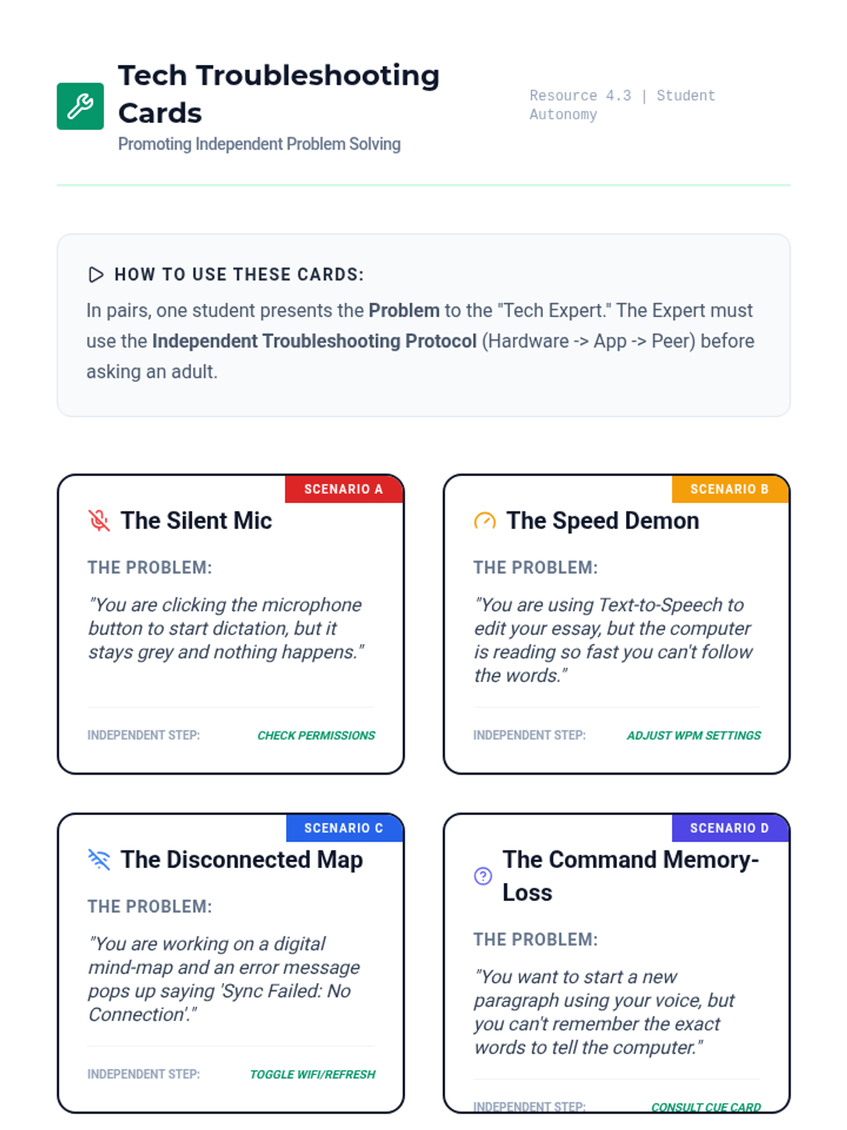 A set of role-play/troubleshooting cards for common assistive technology glitches. Designed to help students practice independent problem-solving before seeking adult help.