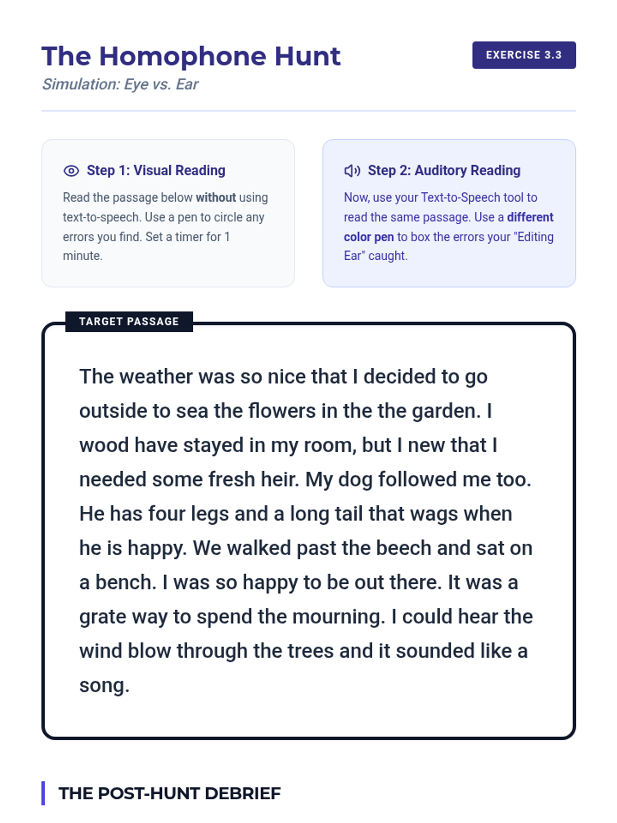 A practice activity for using Text-to-Speech to identify homophones and syntax errors. Includes a passage for comparative visual vs. auditory editing and a debrief section for pedagogical reflection.