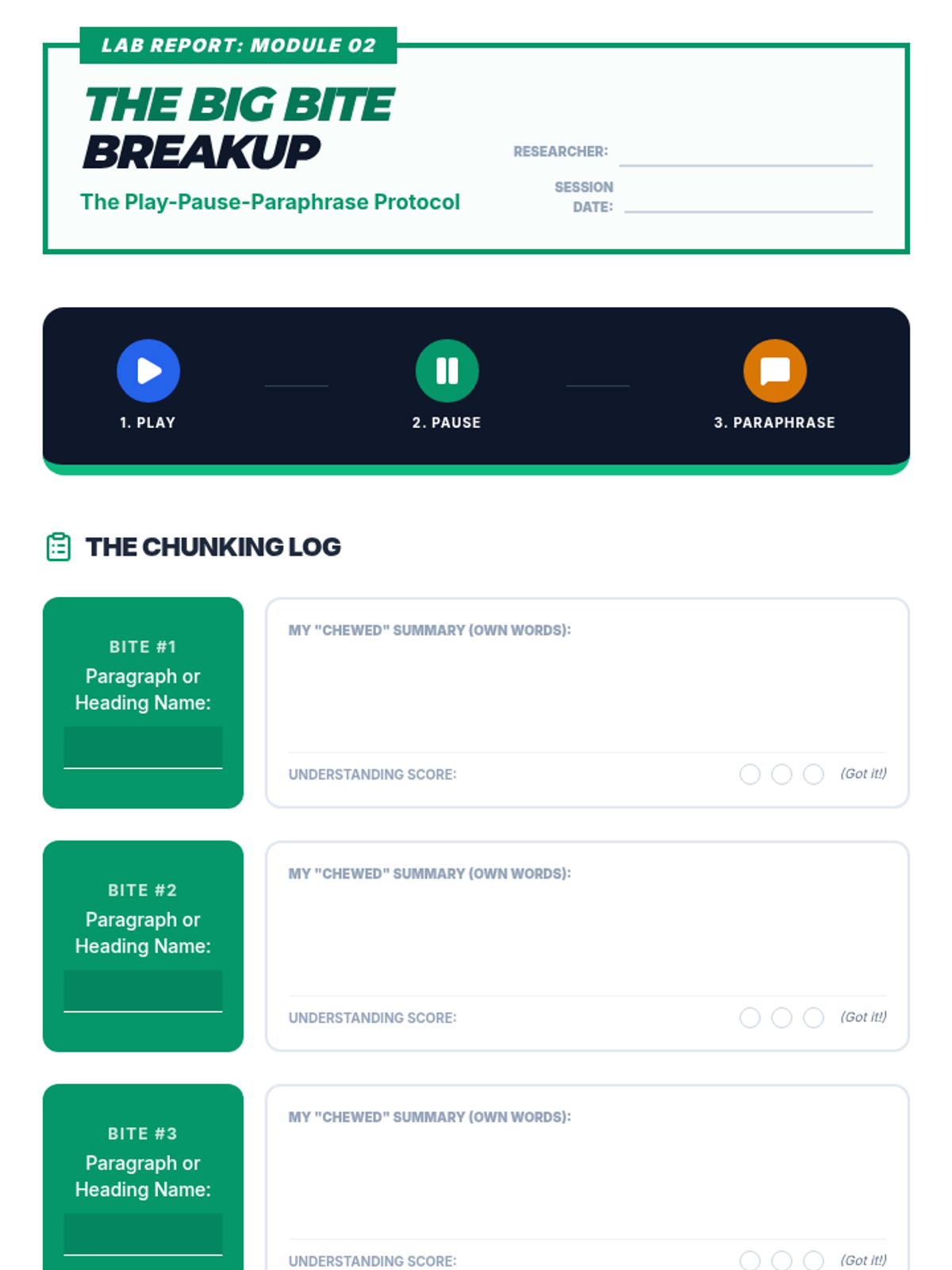 Student activity sheet for Lesson 2, featuring a chunking log to practice the Play-Pause-Paraphrase strategy.