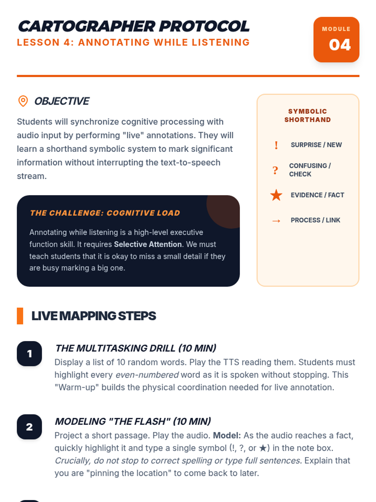 Detailed teacher guide for Lesson 4, focusing on the mapping theme and the live annotation technique for multitasking with TTS.