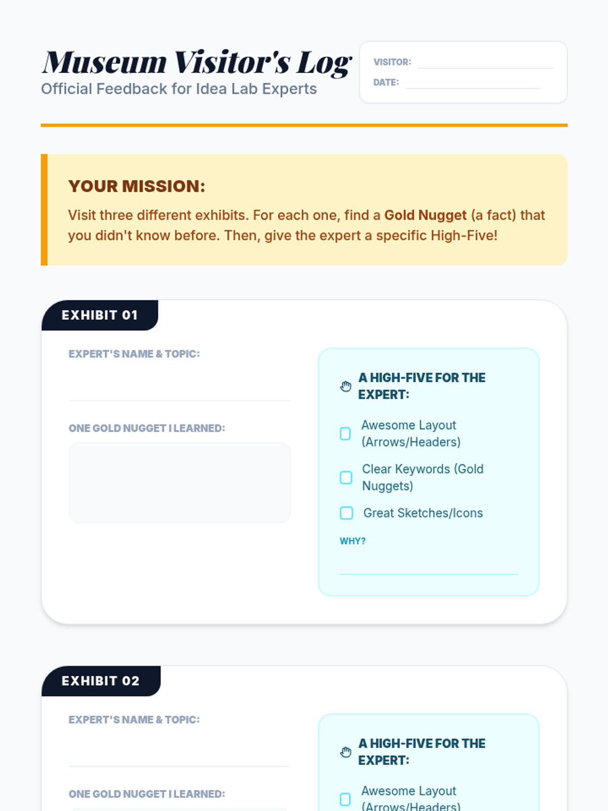 Log sheet for students to use during the Museum Opening gallery walk, recording facts learned from peers and providing structured feedback.