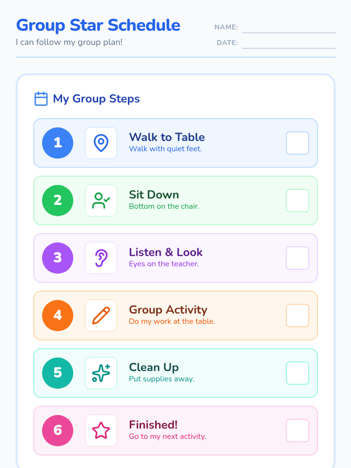 A visual schedule for small group instruction, featuring six clear steps with icons and a built-in token board to reinforce sitting behavior.