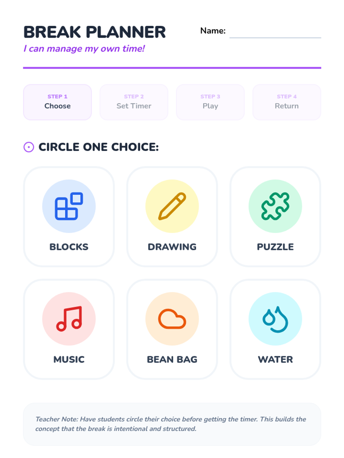 A visual break choice board for students to use when planning their timed breaks, reinforcing intentional choice and time limits.