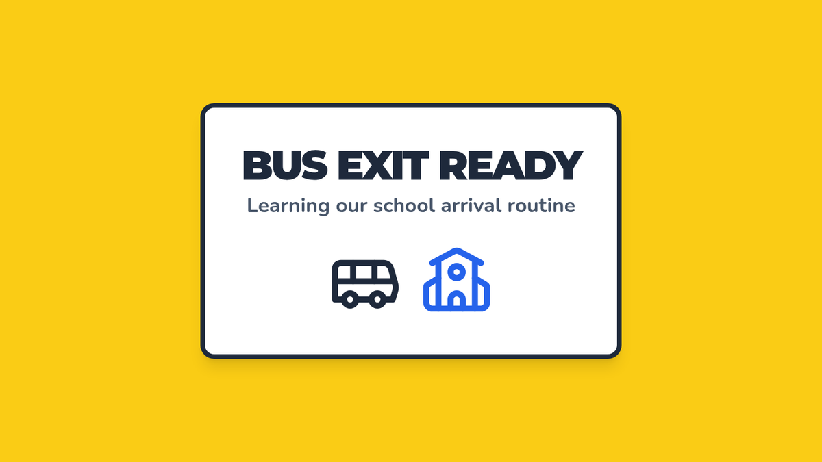 A visual presentation to introduce the bus exit routine to students, featuring large icons and clear instructional text.