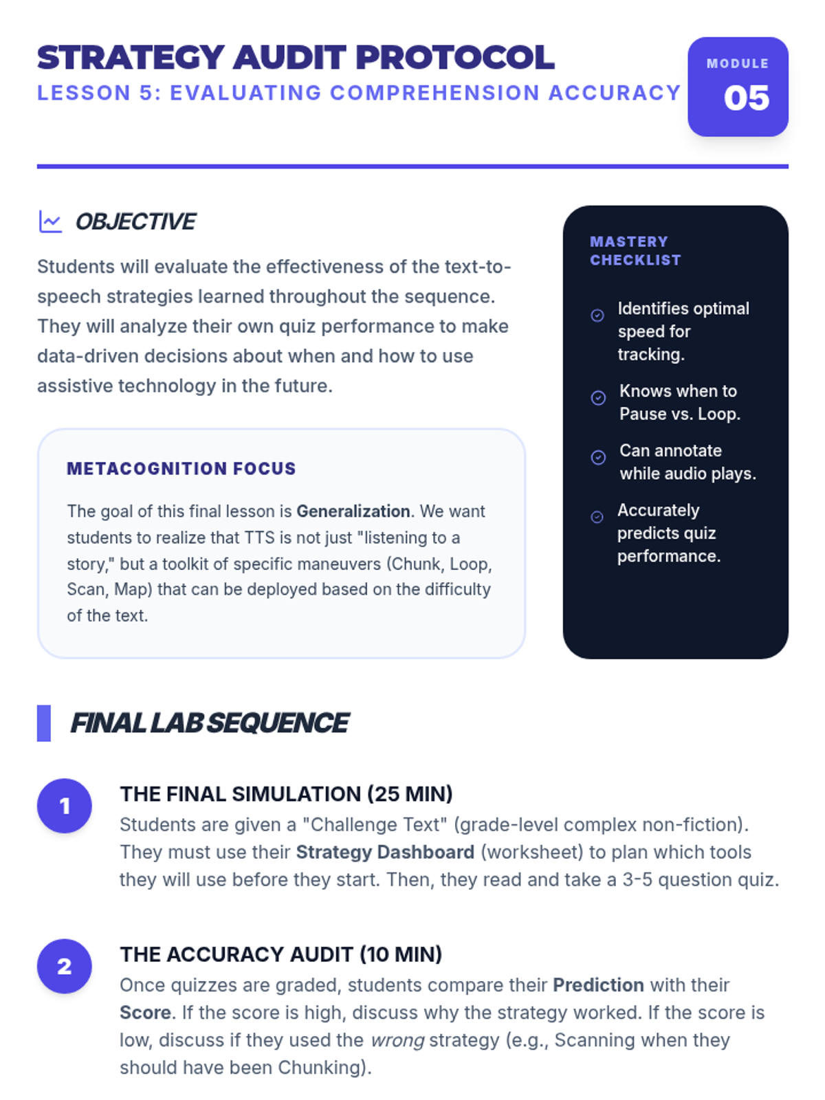 Detailed teacher guide for Lesson 5, focusing on strategy selection, metacognitive reflection, and identifying when to use TTS support versus silent reading.