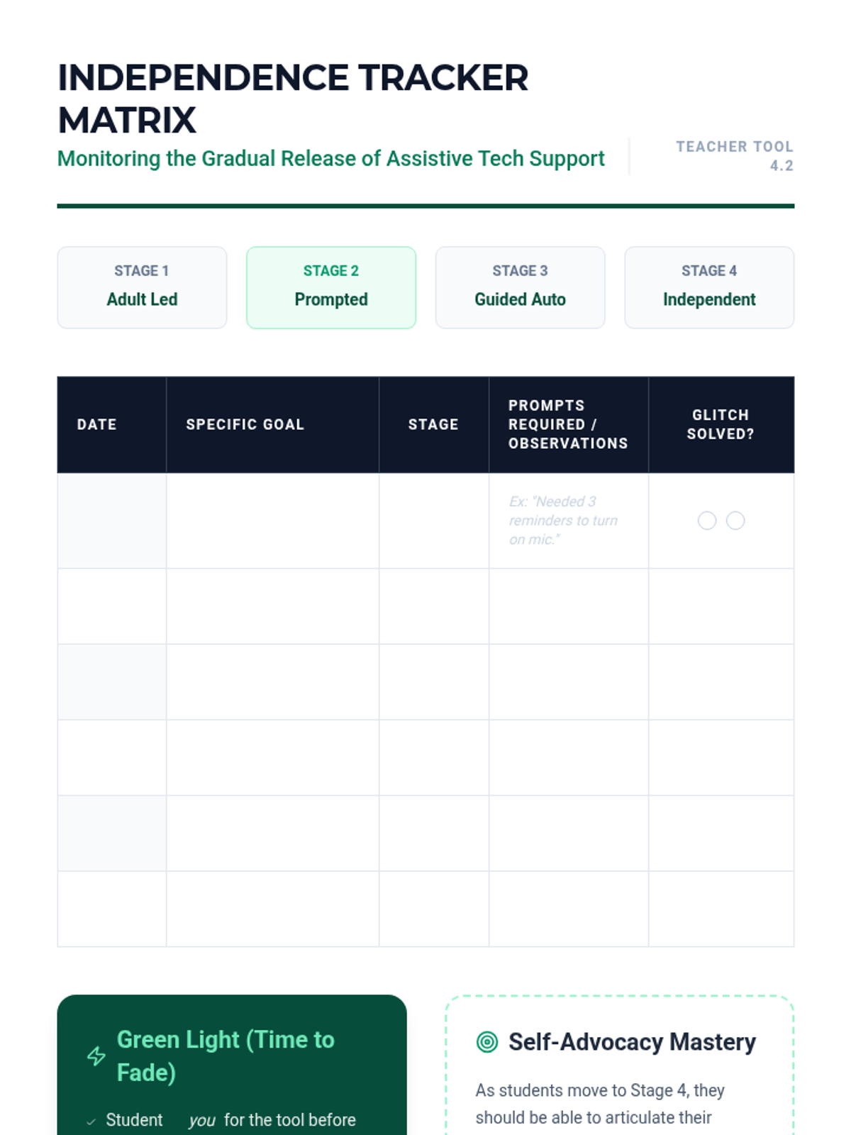 A data collection/tracking tool for teachers to monitor student independence with assistive technology across four stages of support.