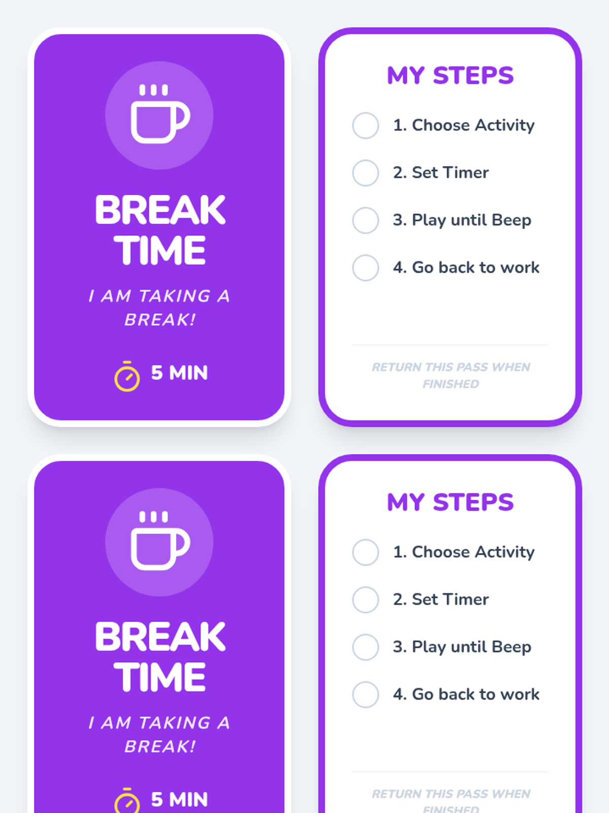 Visual break passes for students to carry, reminding them of the steps to independently manage their timed break and return to work.