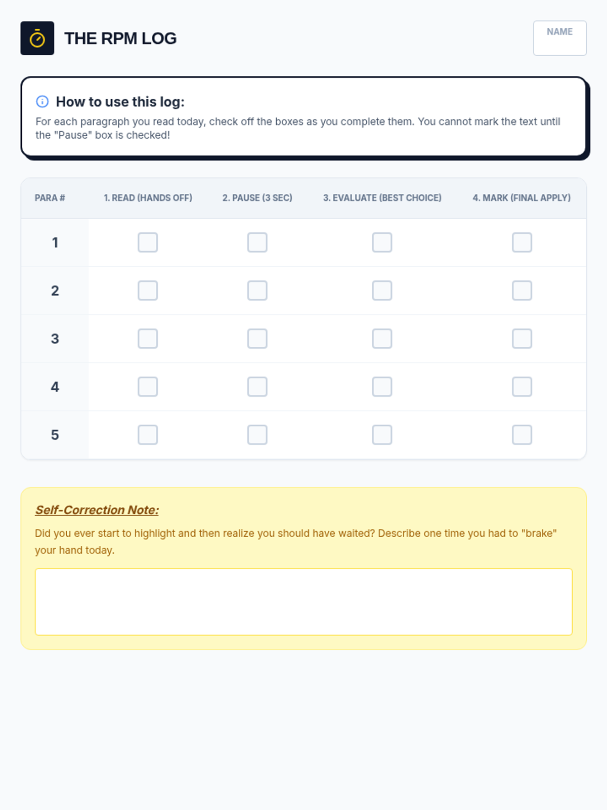 A tracking log for Lesson 4 where students monitor their 'Read, Pause, Evaluate, Mark' cycle for five separate paragraphs.
