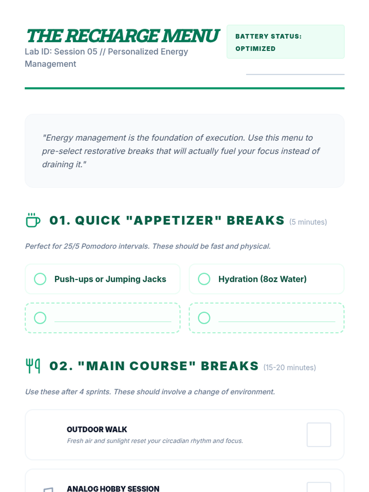 A worksheet for students to differentiate between restorative and depleting breaks, creating a personalized 'menu' of energy-management strategies.