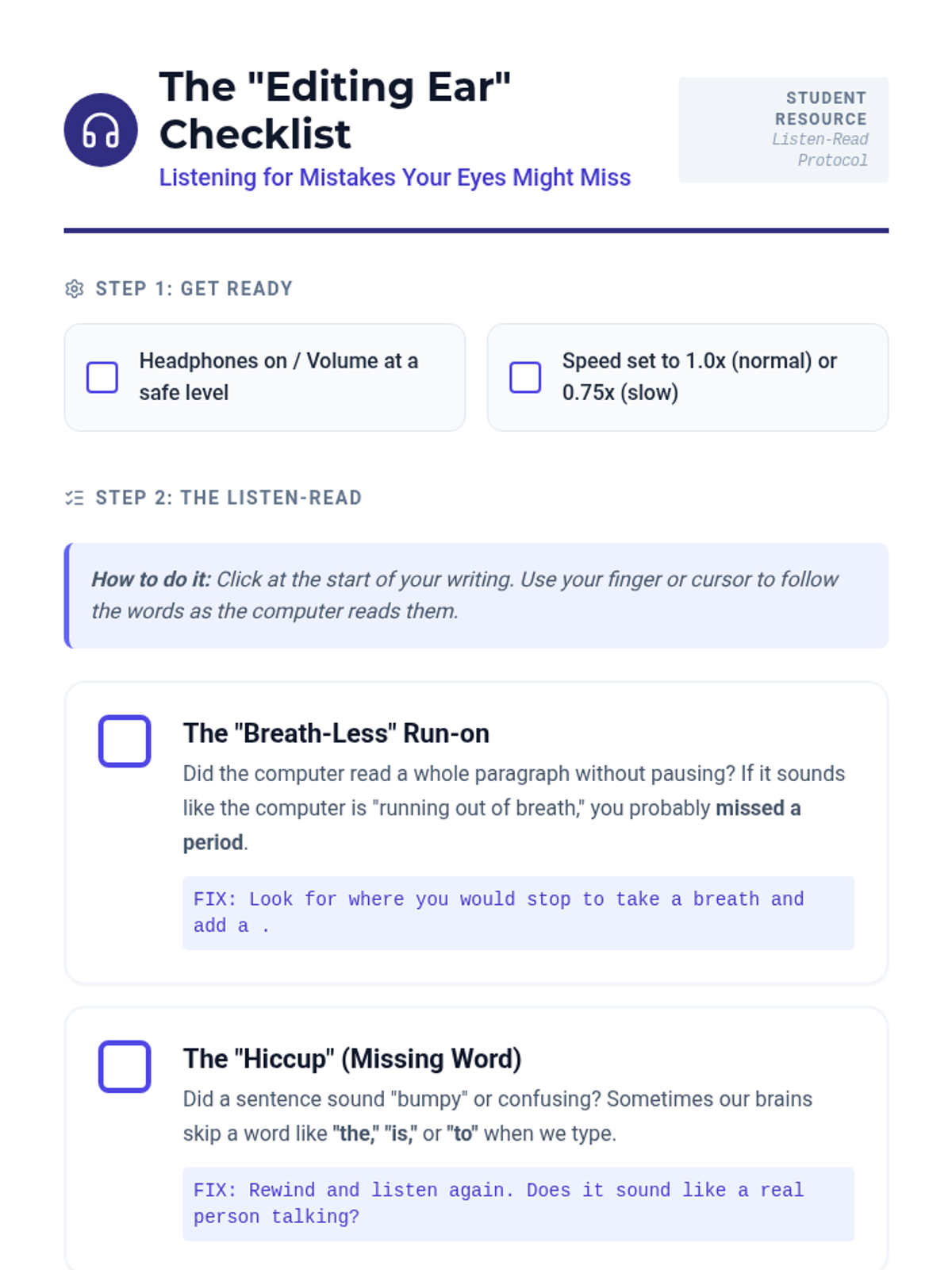 A student self-monitoring checklist for use with Text-to-Speech proofreading. Features visual cues for common errors like run-on sentences, missing words, and homophones.