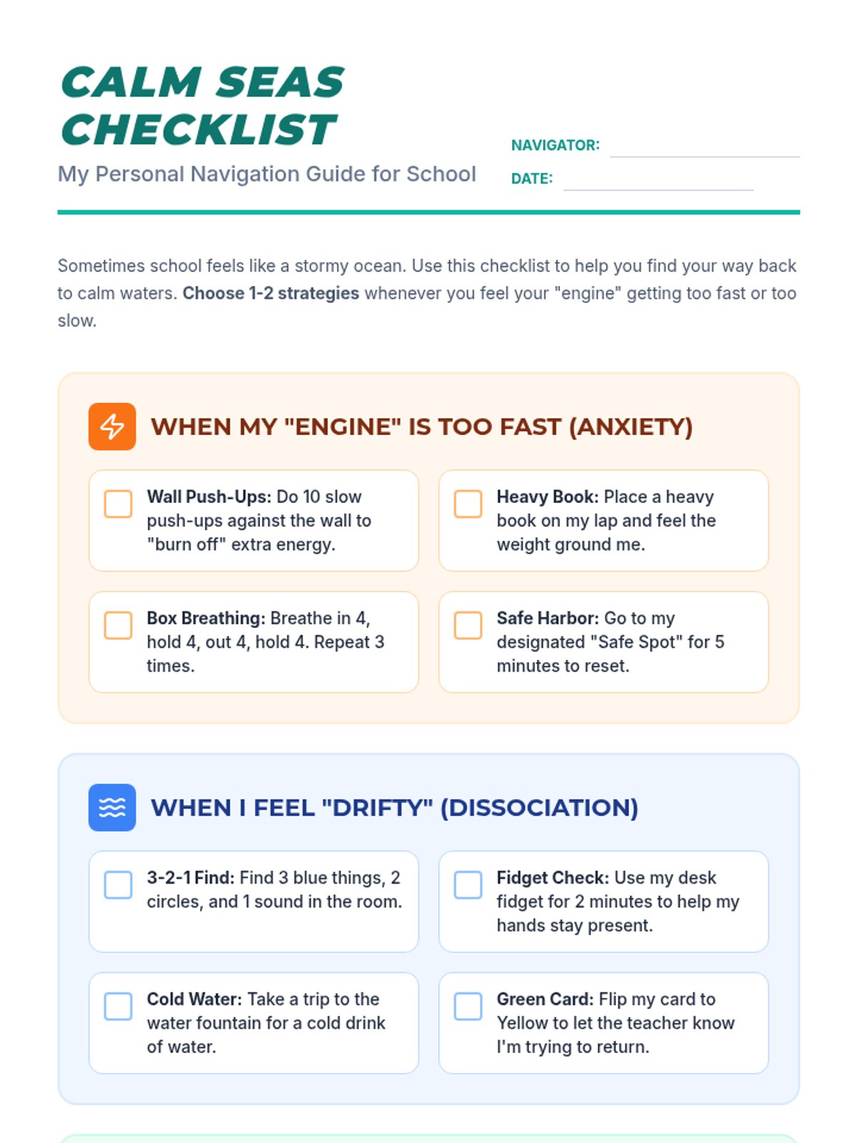 A student-facing checklist of coping strategies for managing anxiety, dissociation, and focus challenges. Styled with a "Calm Seas" nautical theme for accessibility and empowerment.
