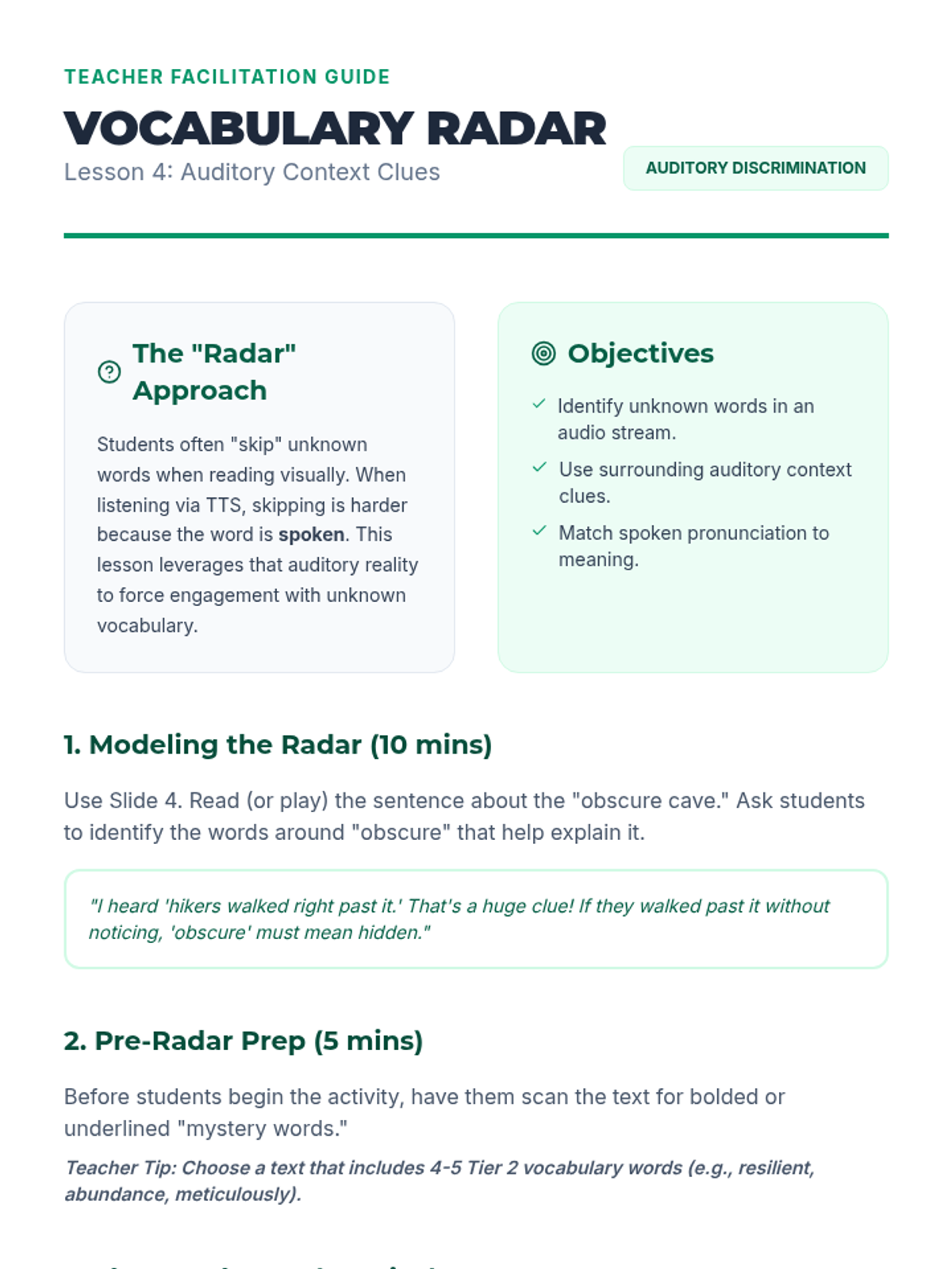 Teacher guide for Lesson 4, providing instructions on using auditory context clues and managing the "Word Hunt" activity.