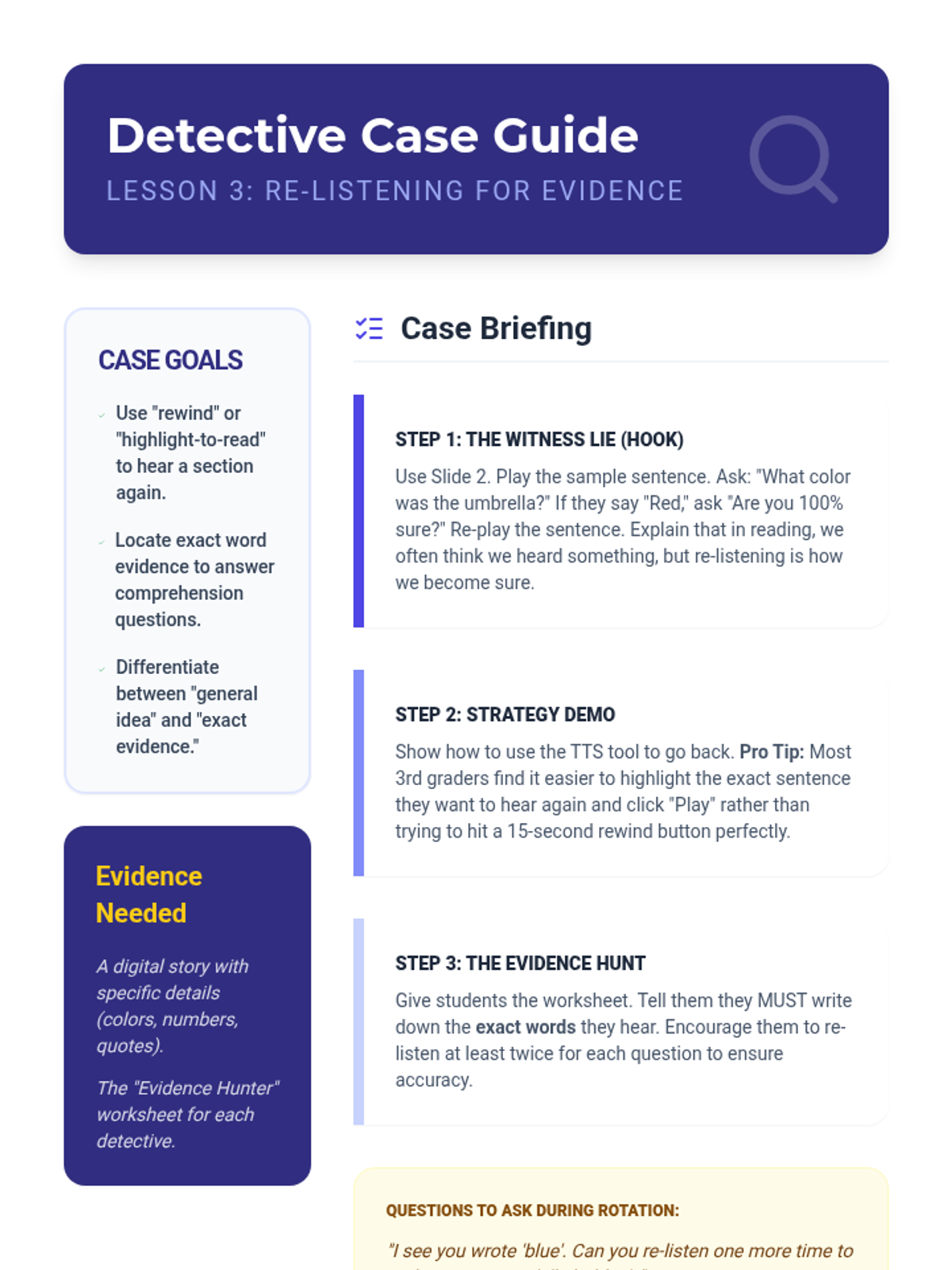 Slides for Lesson 3, focusing on how to use rewind and re-listening tools to locate evidence in narrative text.
