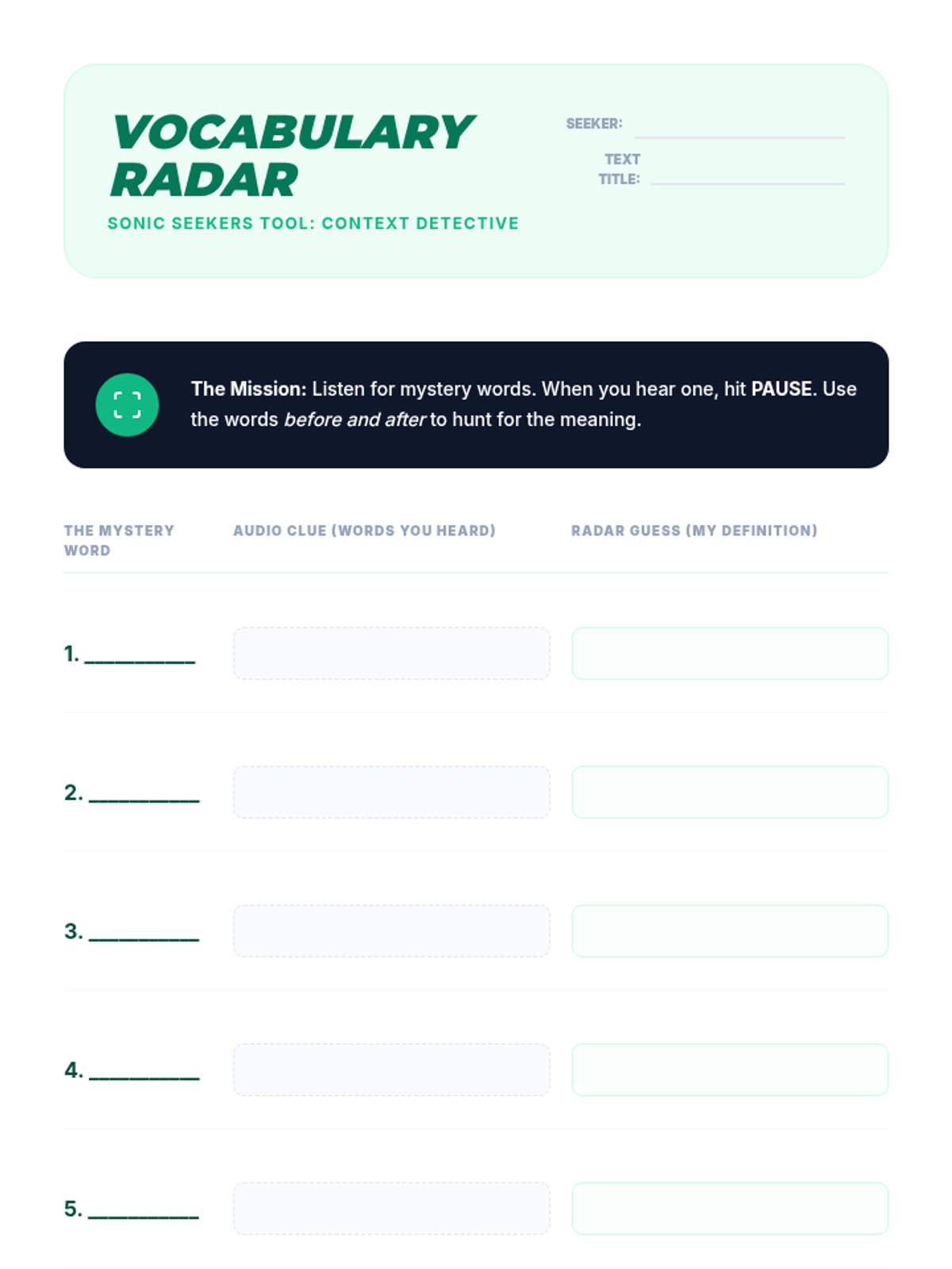 Vocabulary worksheet for Lesson 4, allowing students to record unknown words, auditory context clues, and inferred definitions while using TTS.