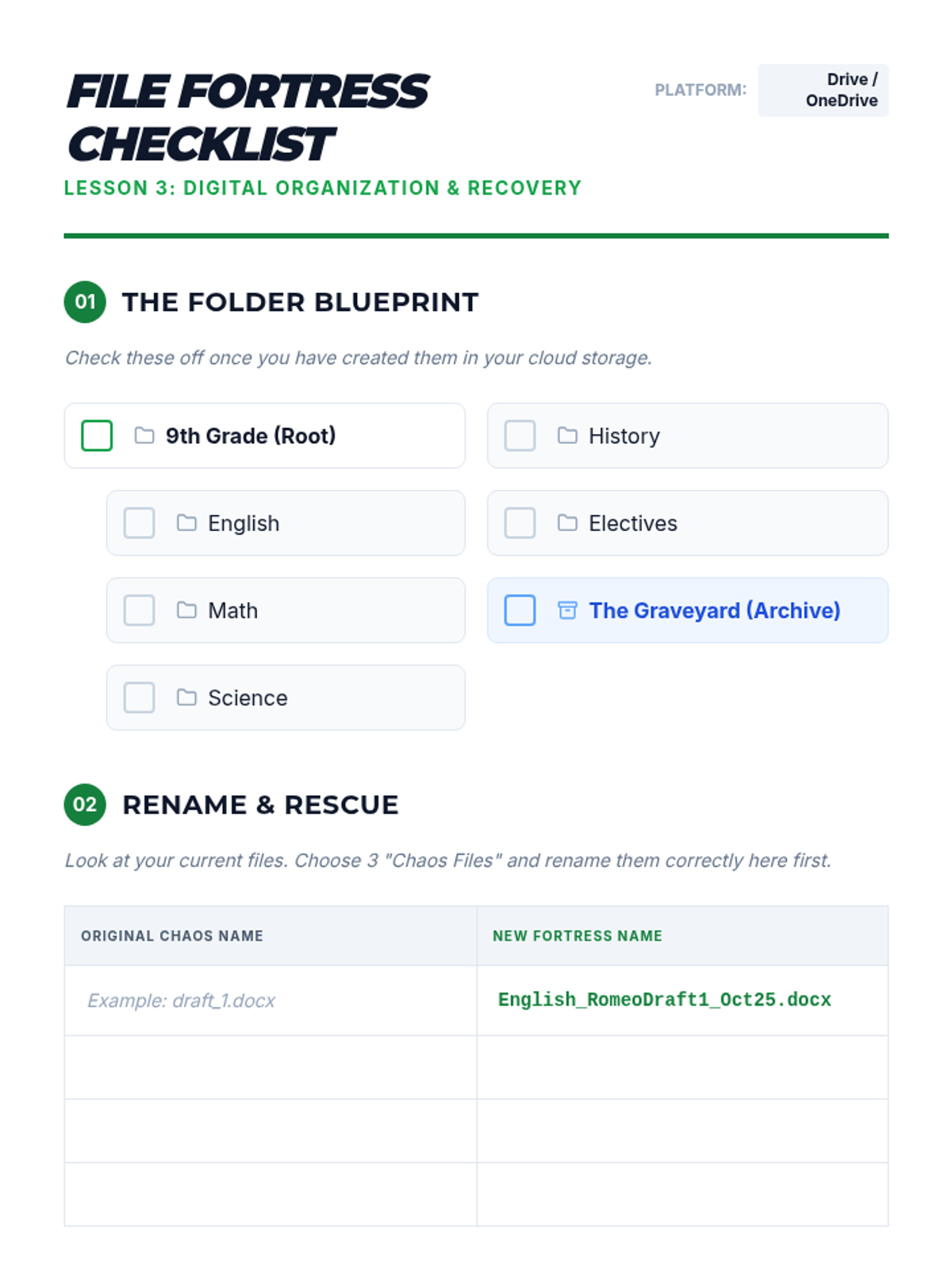 A guide for students to set up their digital folder hierarchy and practice professional file naming conventions.