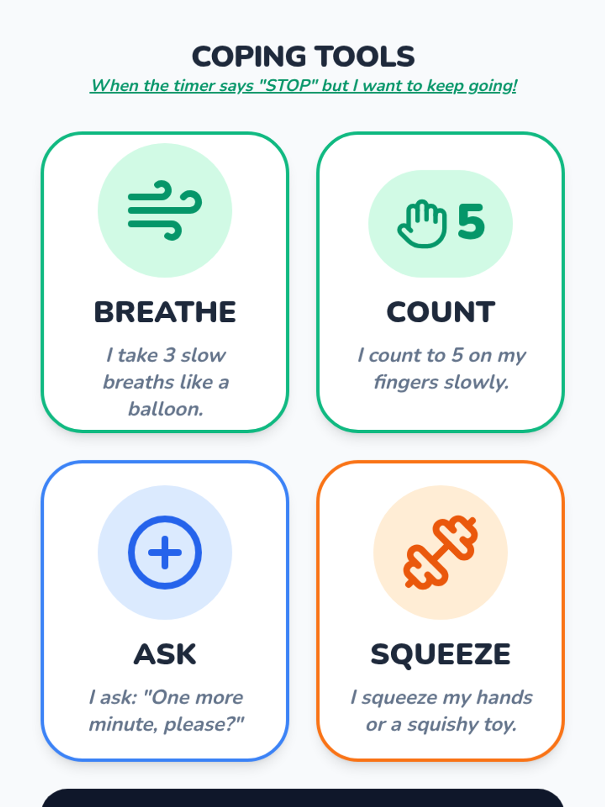 Choice cards for students to pick a coping strategy when they feel upset about a timer-triggered transition.
