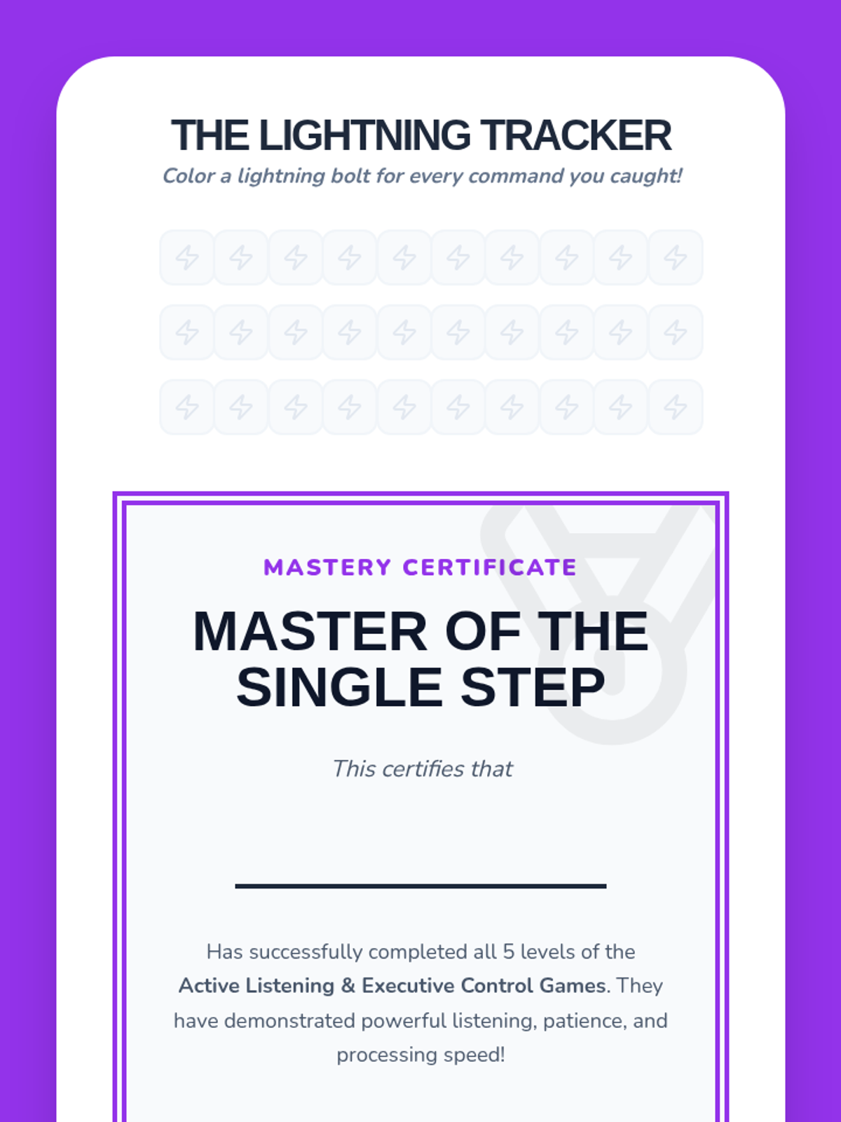 Final completion certificate and rapid-fire points tracker for Lesson 5, celebrating mastery of the single-step focus sequence.
