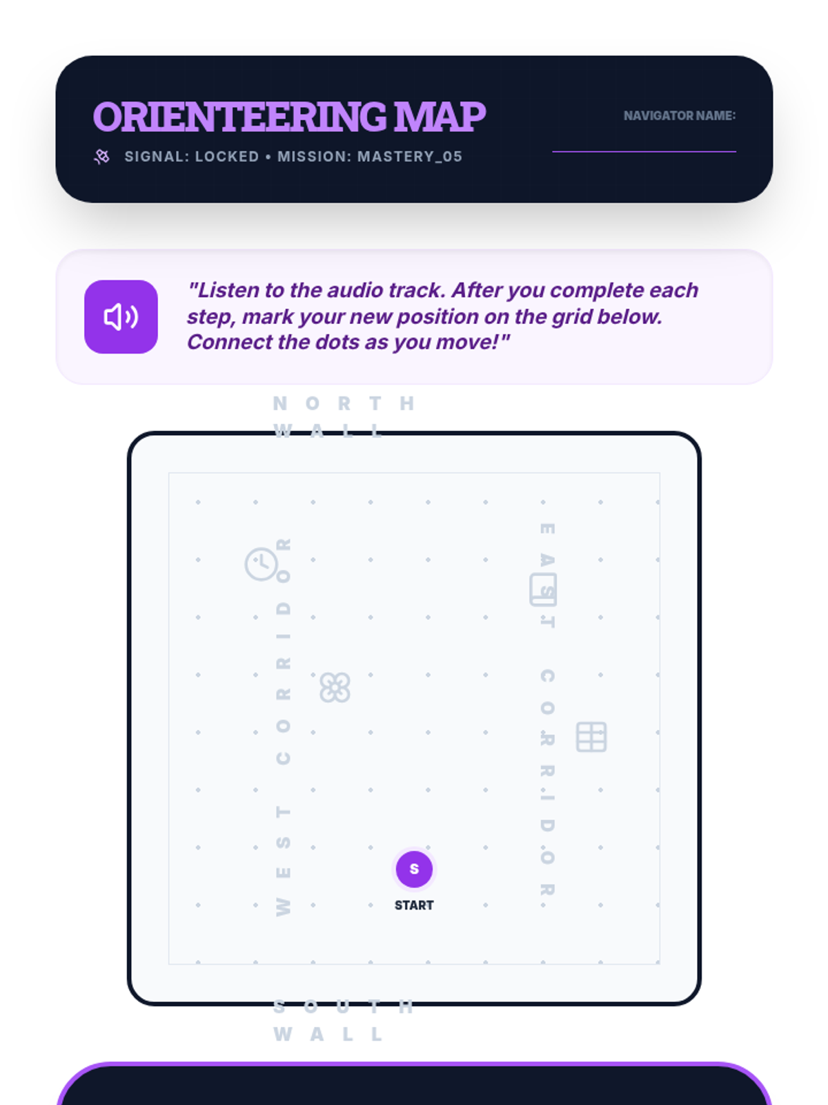 A simplified grid map of the room where students draw their path based on the audio prompts, helping visualize sequential progress and auditory pacing.