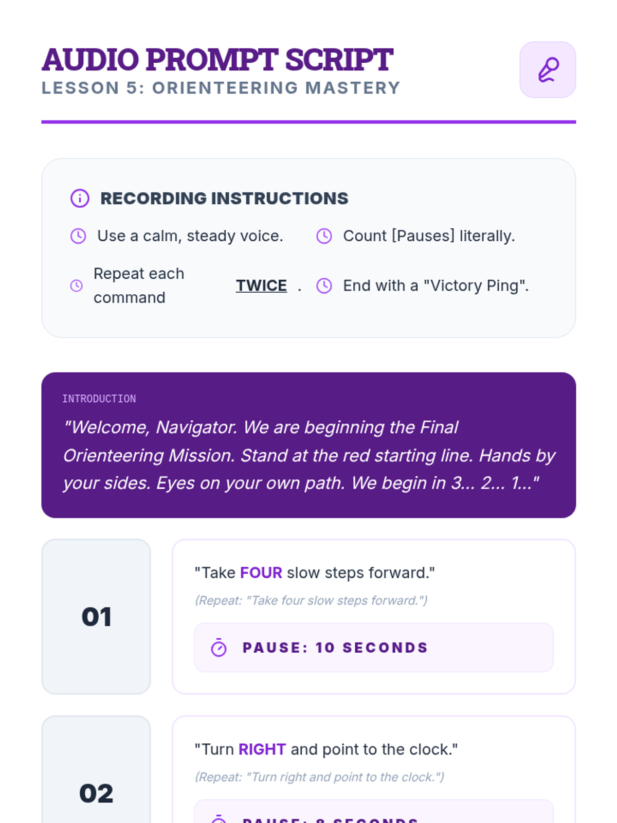 A script for the teacher to record or read live, featuring timed pauses and repeated commands to build auditory processing tolerance.