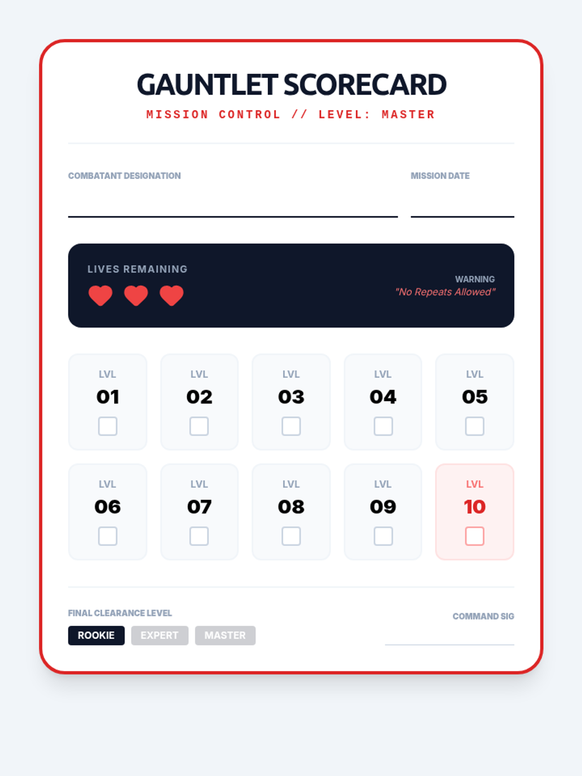 Student scorecard for tracking progress and lives during the final 10-level instruction gauntlet.