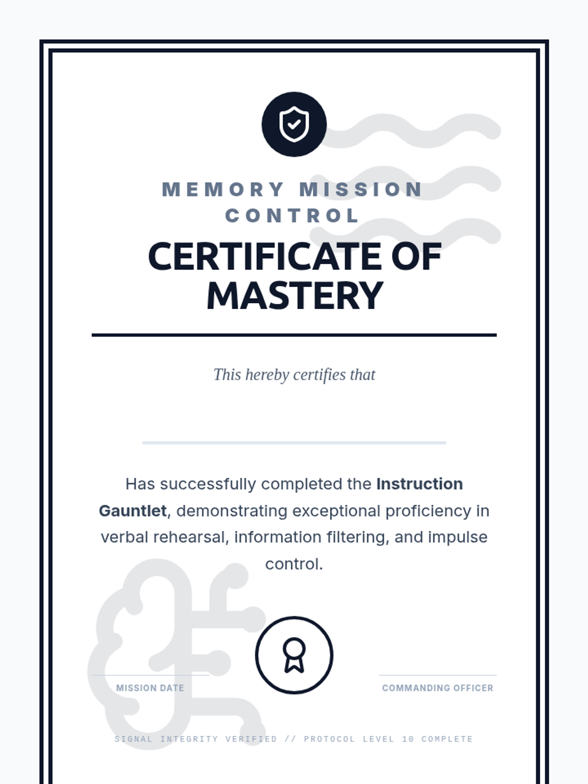 Completion certificate for students who successfully navigate the Memory Mission Control sequence and the final Gauntlet challenge.