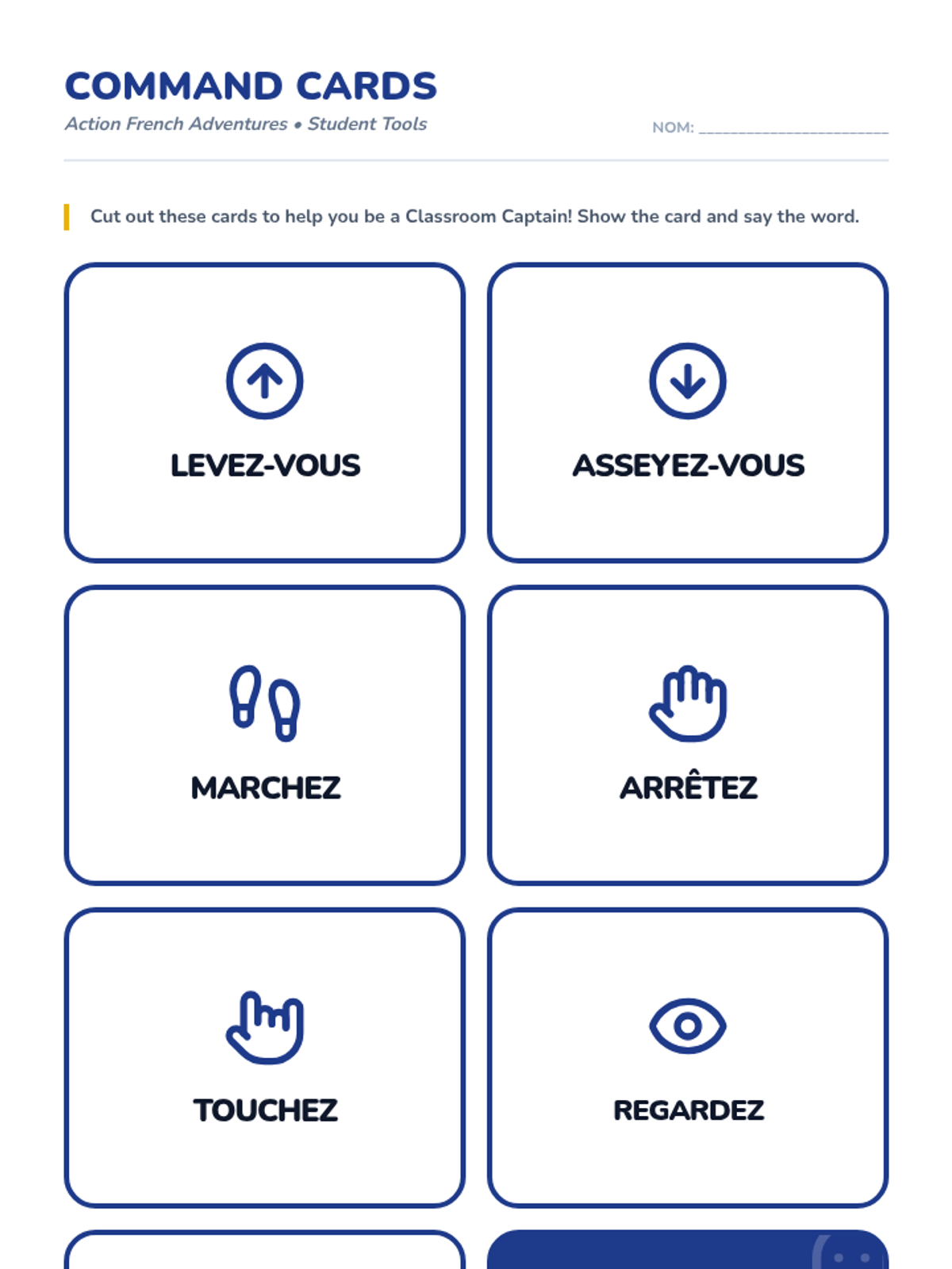 Set of printable visual command cards to help Kindergarten students issue French instructions to their peers during the Classroom Captain workshop.