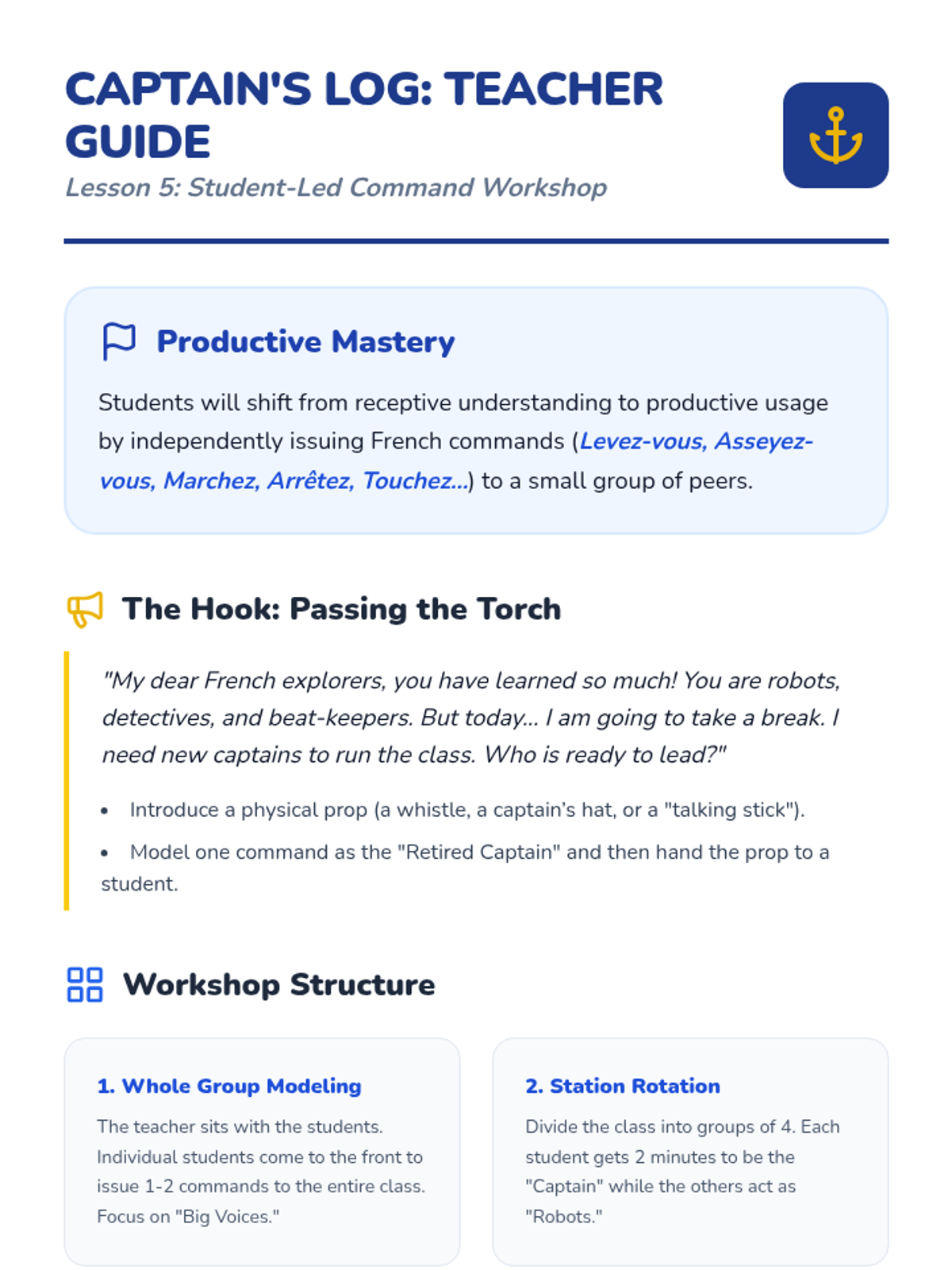 Teacher facilitation guide for Lesson 5, focusing on productive command usage and student leadership in small groups.