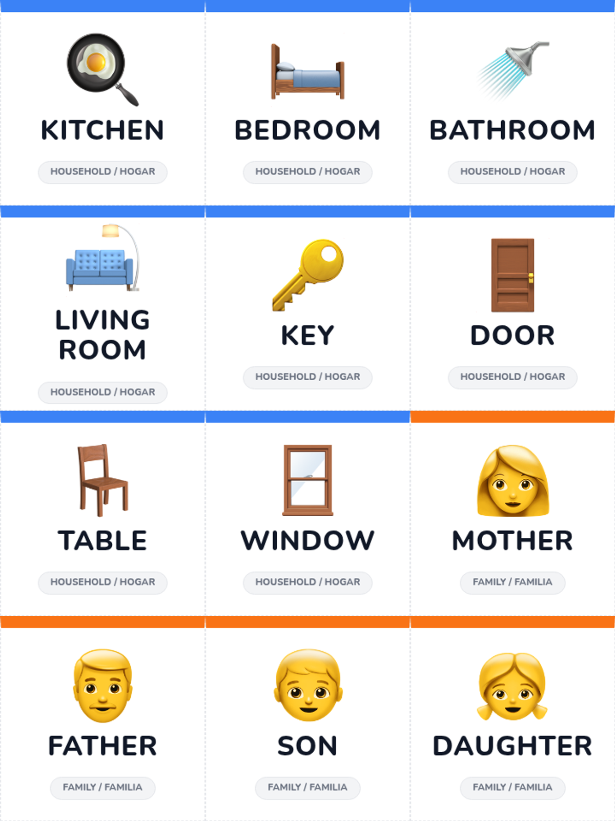 A complete set of 48 double-sided bilingual flashcards (English/Spanish). Categories include Household, Family, Groceries, School, Community, and Travel. Features large visuals, clear fonts, and color-coded borders for easy sorting and duplex printing.