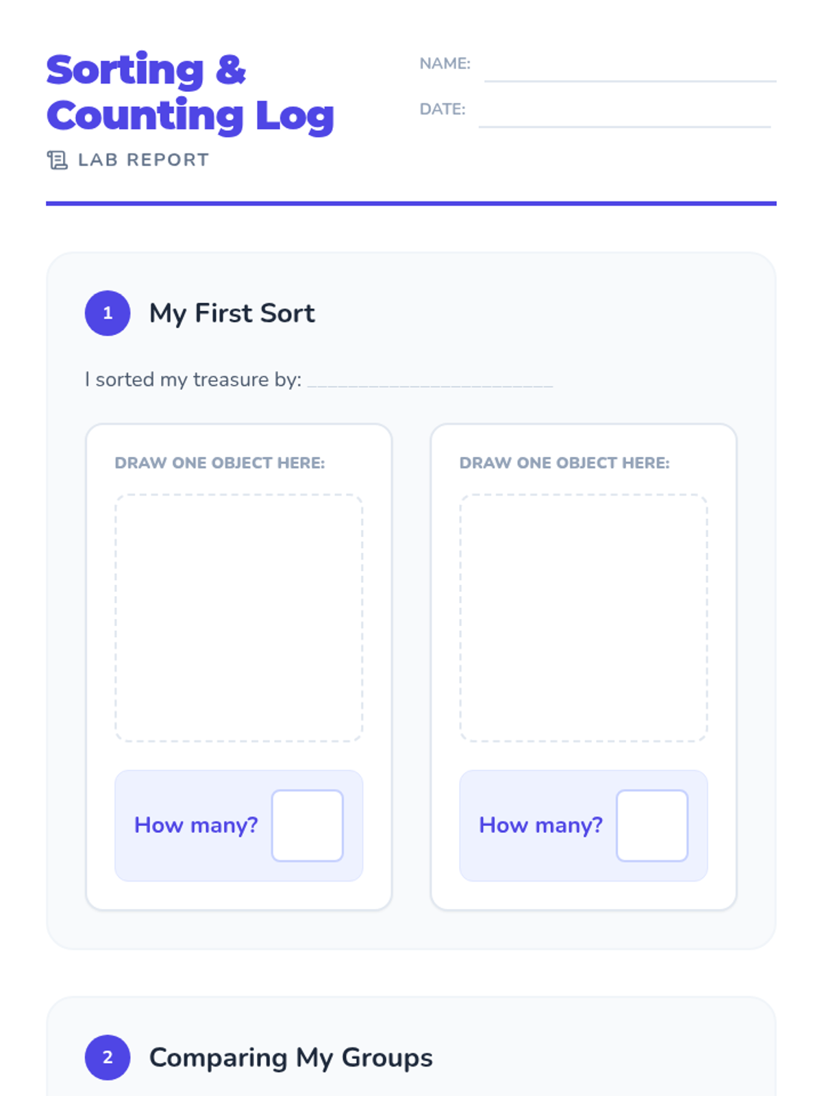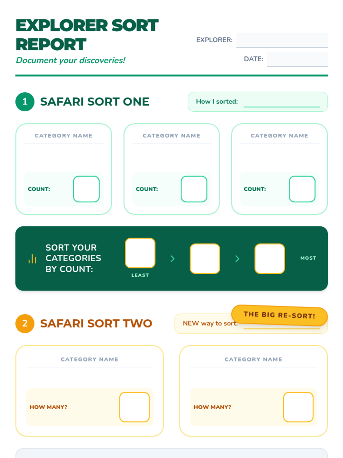 A student worksheet for recording sorting criteria, individual group counts, and comparing quantities after a hands-on activity.