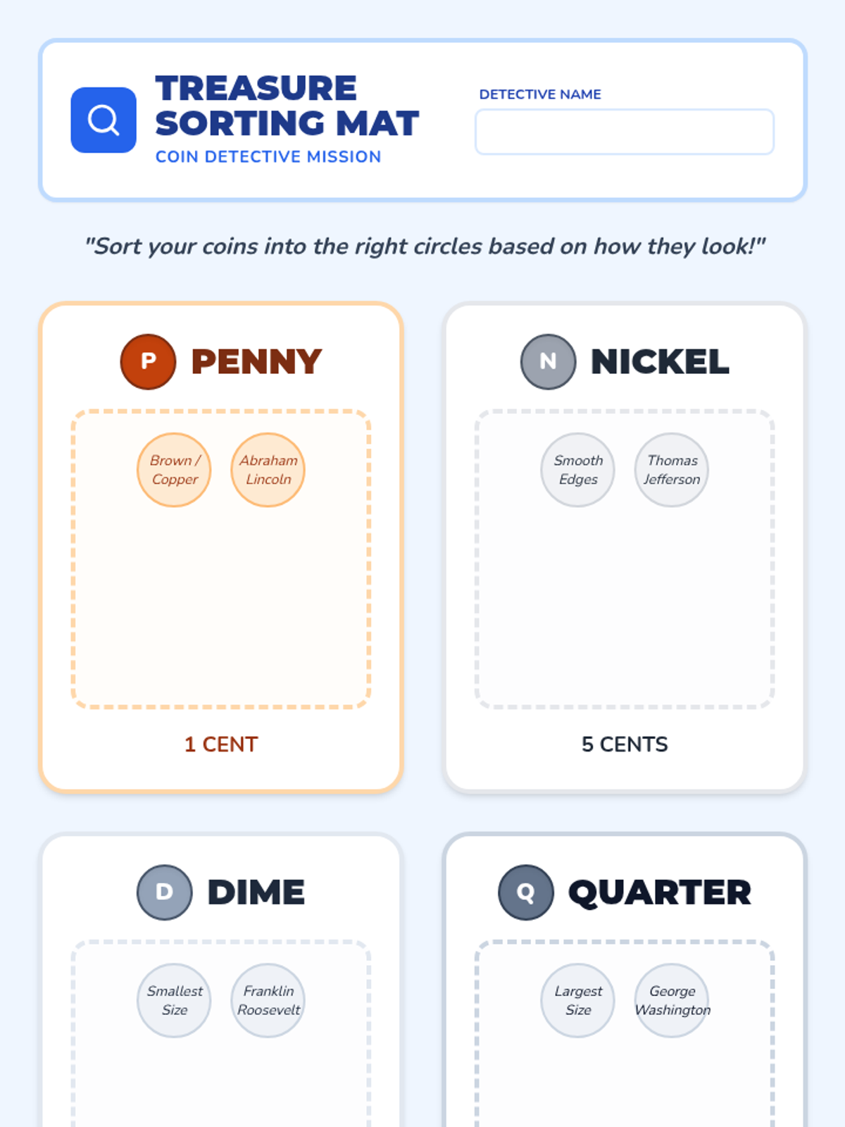A printable sorting mat for Kindergarten/1st Grade students to organize Penny, Nickel, Dime, and Quarter play coins based on visual attributes.