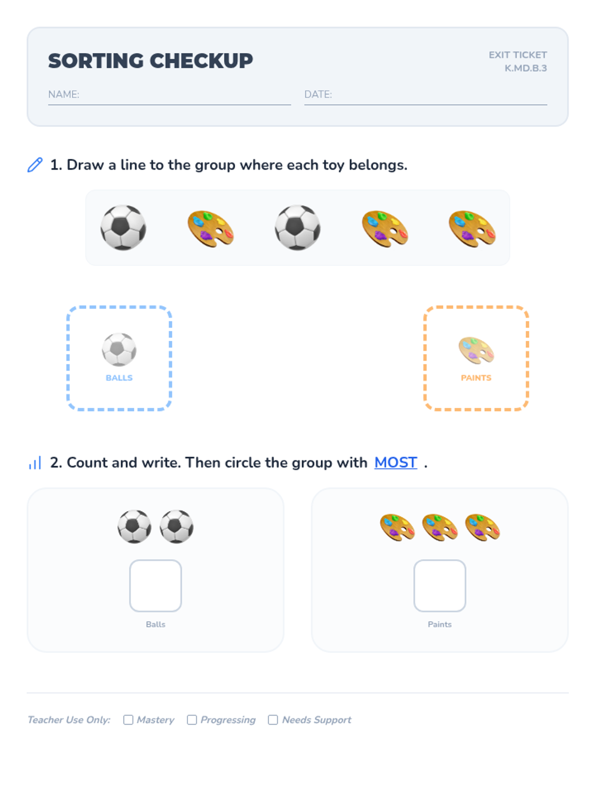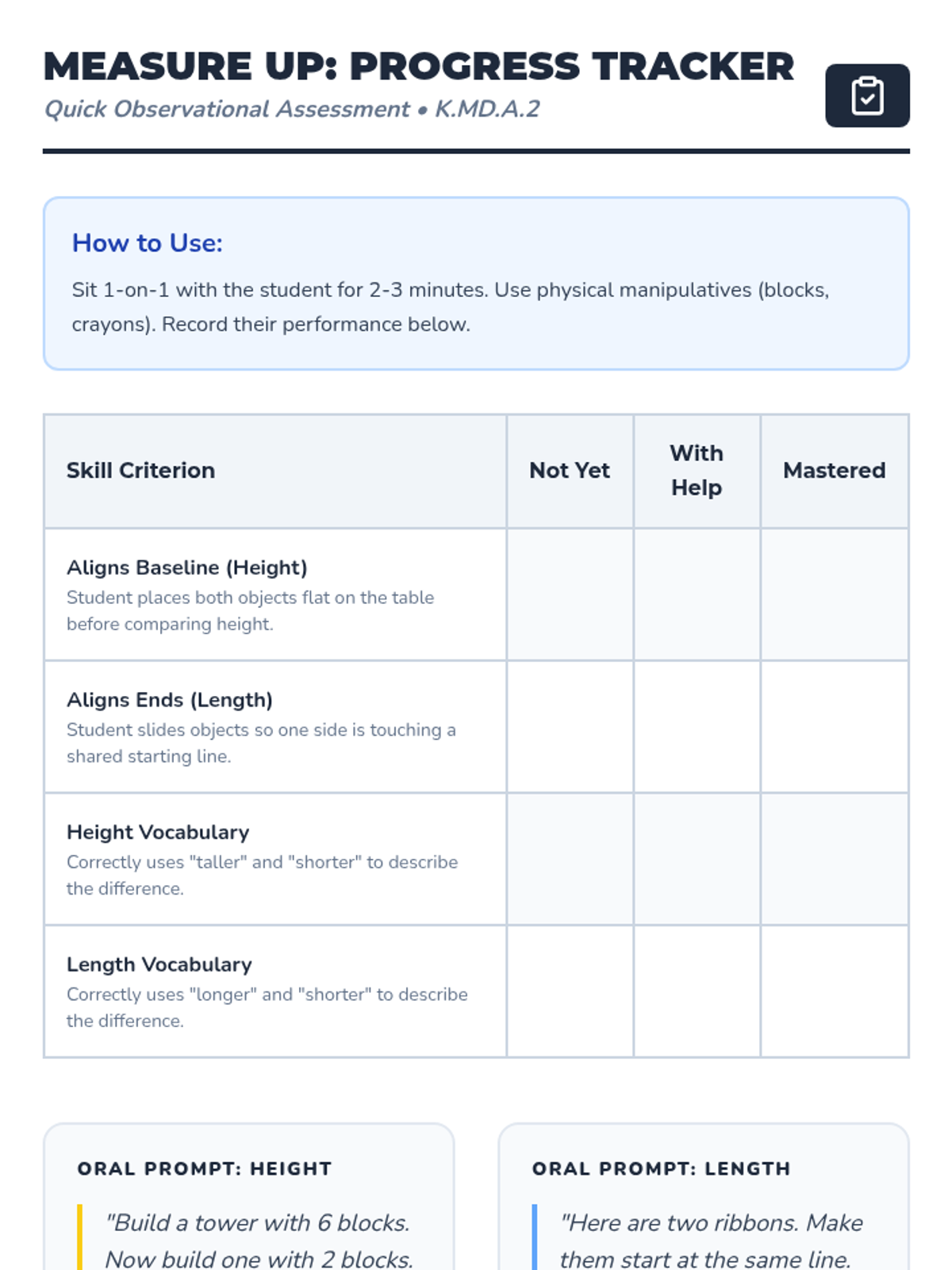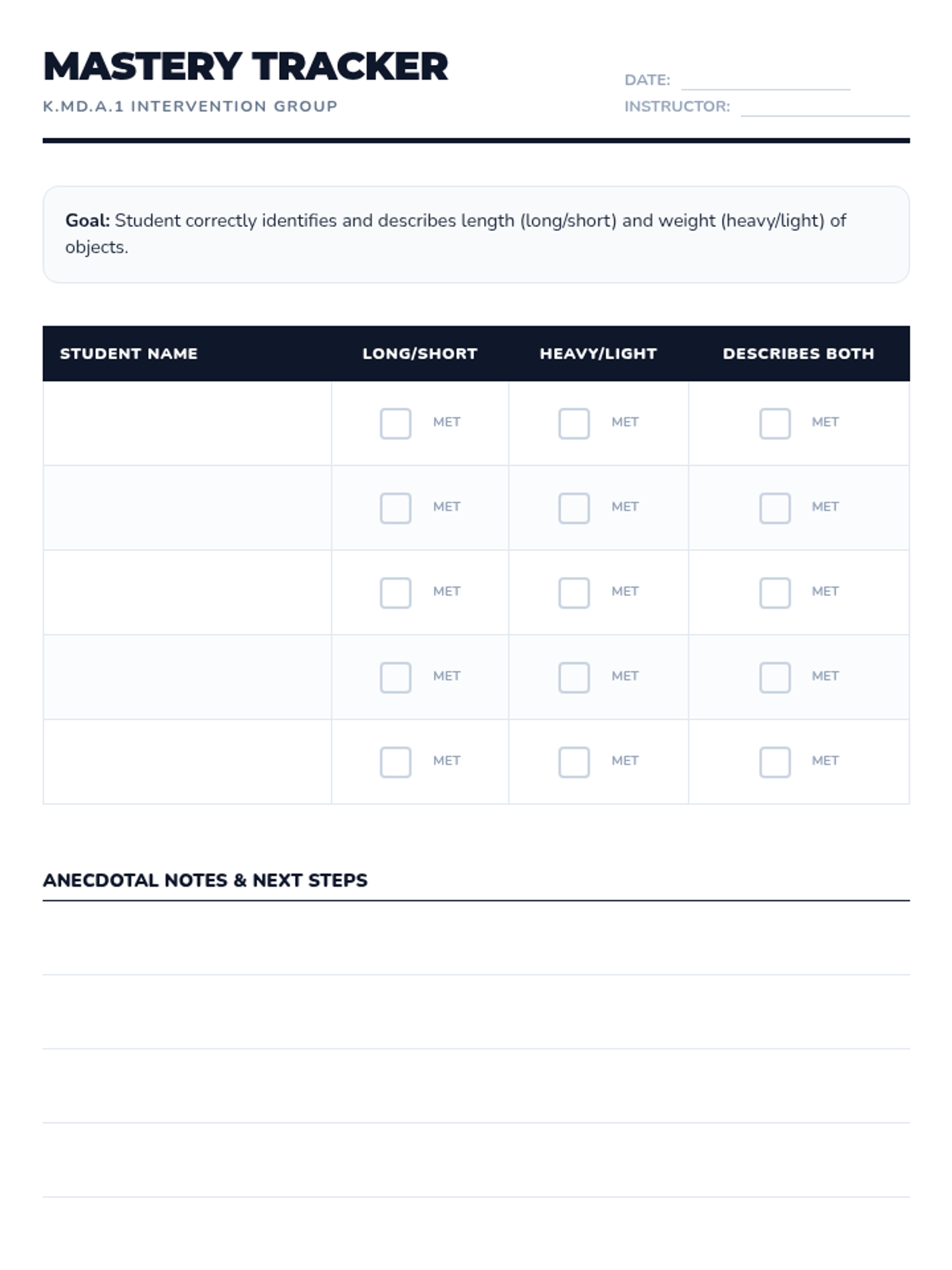 A comprehensive teacher-facing tracking sheet to monitor student progress against sorting, counting, and comparing standards during the intervention session.