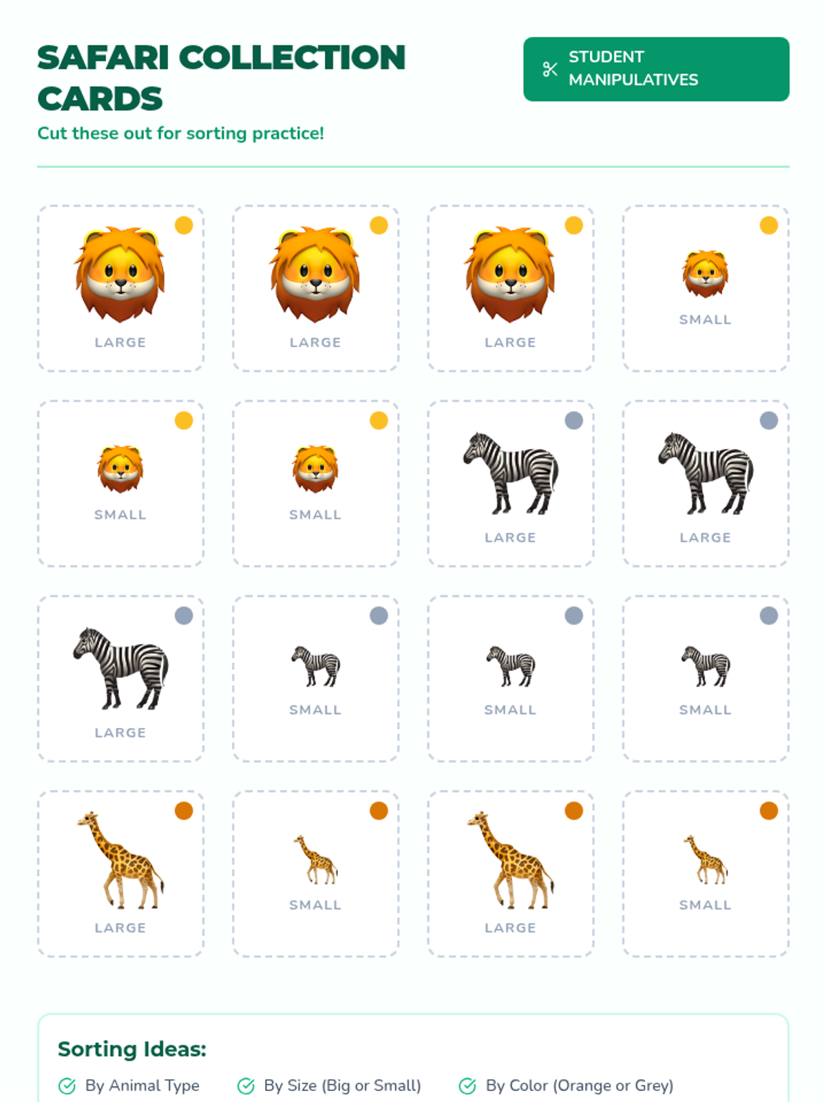 A set of 16 printable animal cards designed for sorting activities. Each card features an animal with distinct attributes (type, size, and color) to allow for multiple ways of classifying the same set.