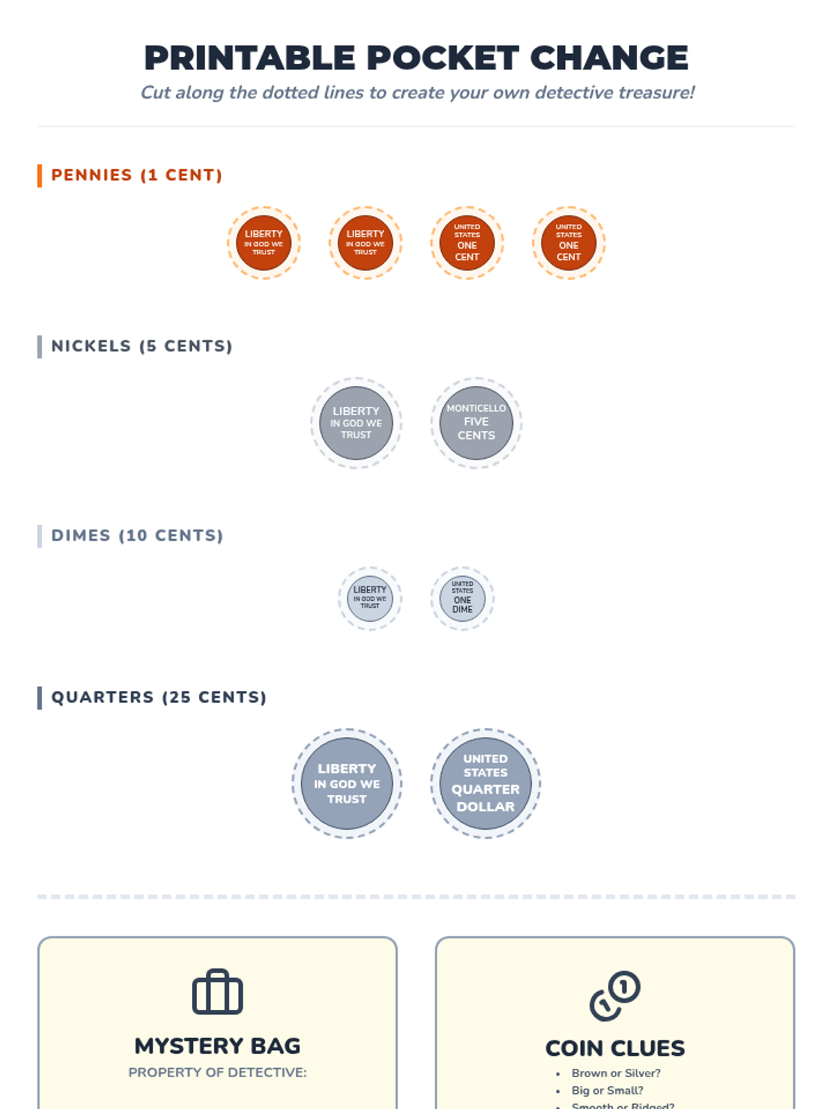 A sheet of high-quality printable U.S. coins for students to cut out and use with their mats, including labels for the Mystery Bag activity.