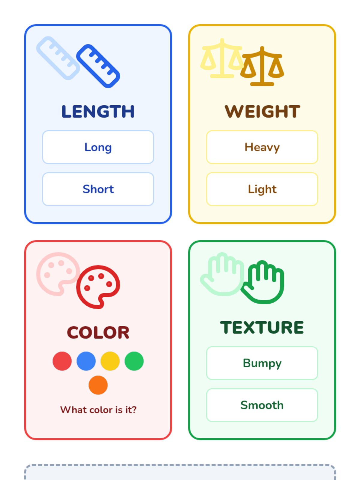 Visual prompt cards (Length, Weight, Color, Texture) for students to use as manipulatives alongside the sorting mat to help identify and label attributes.