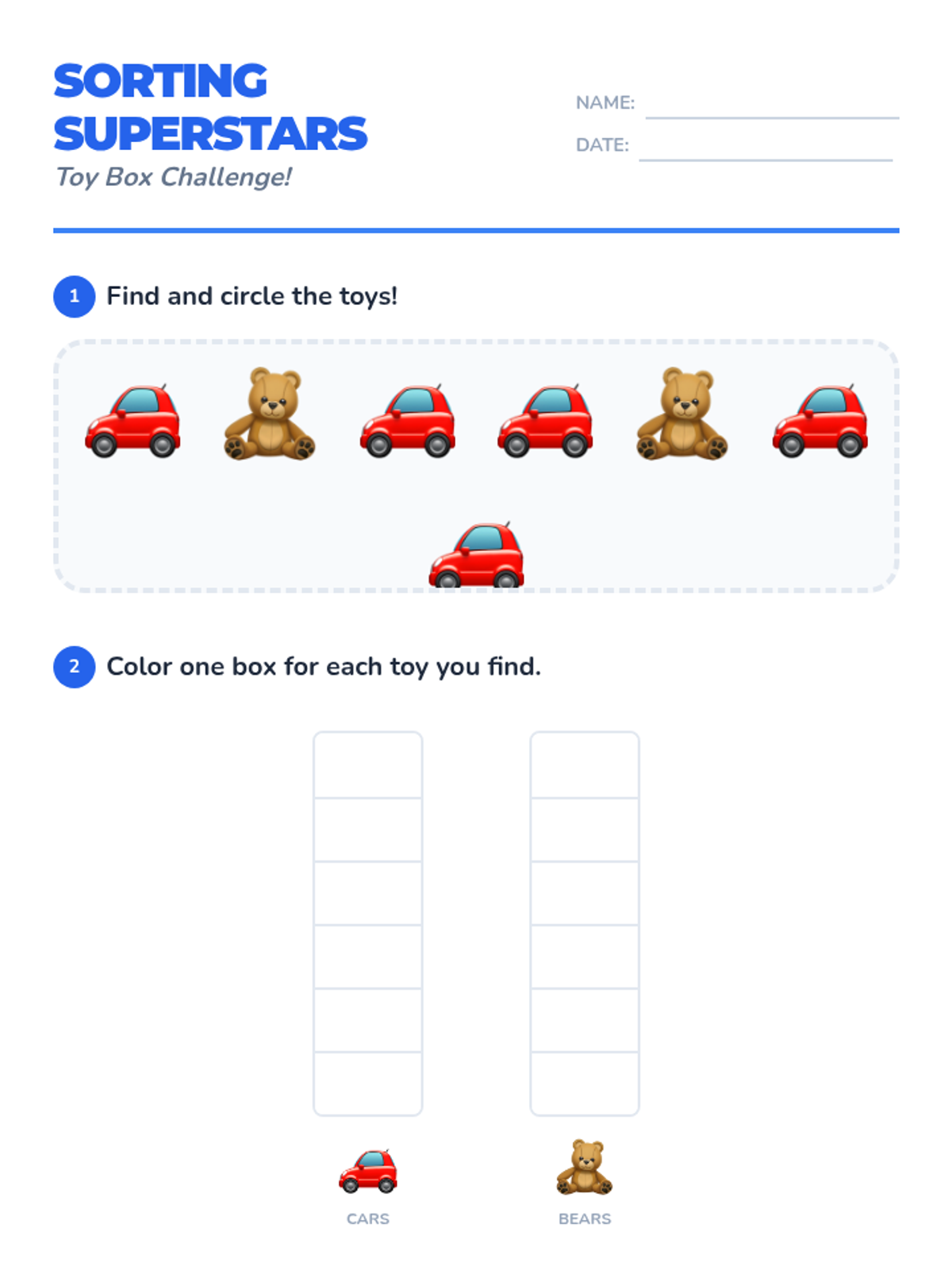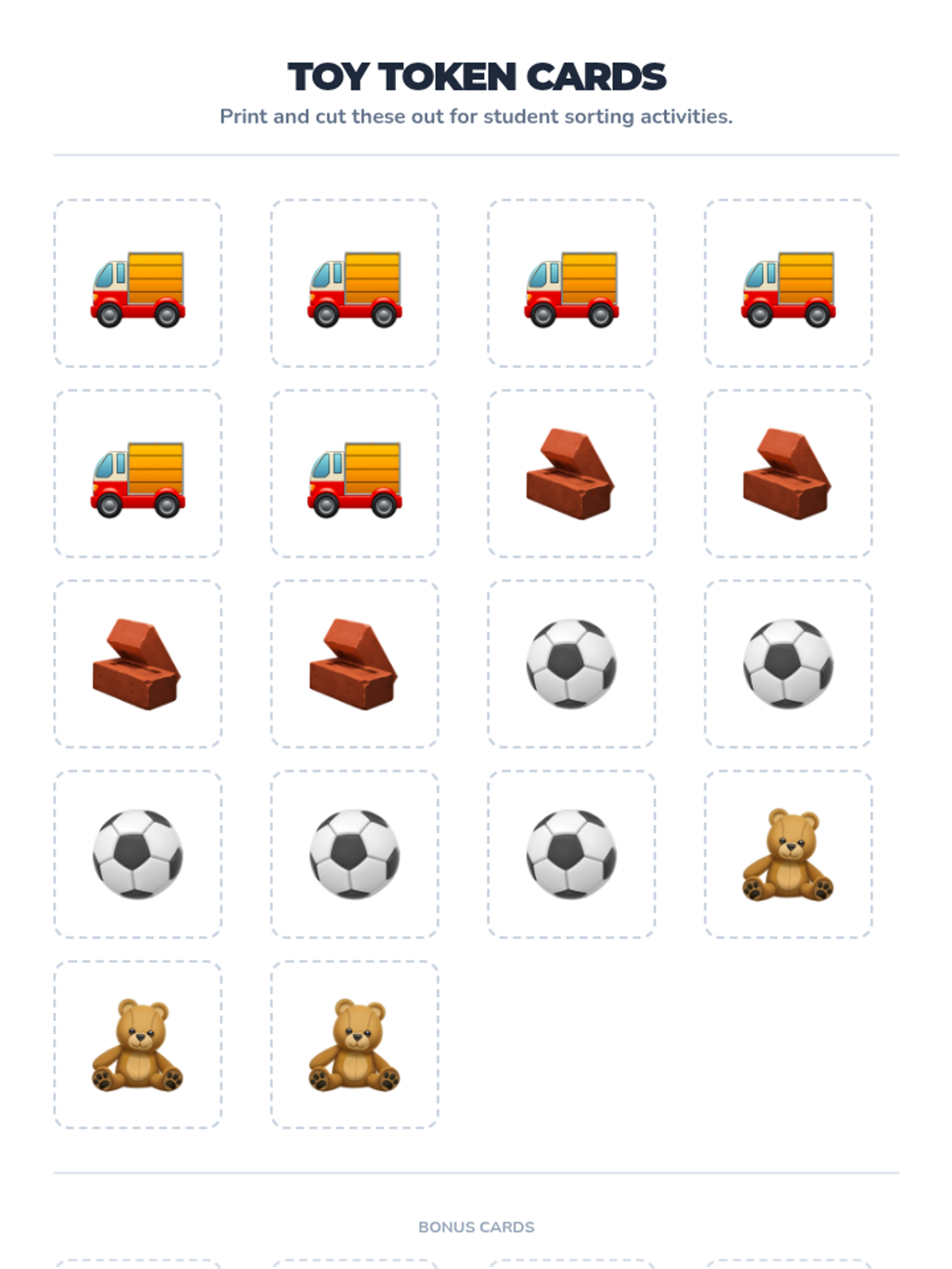 Printable toy tokens for hands-on sorting and counting activities, featuring various toy categories with different counts.